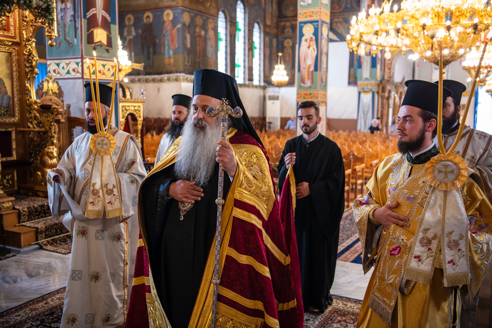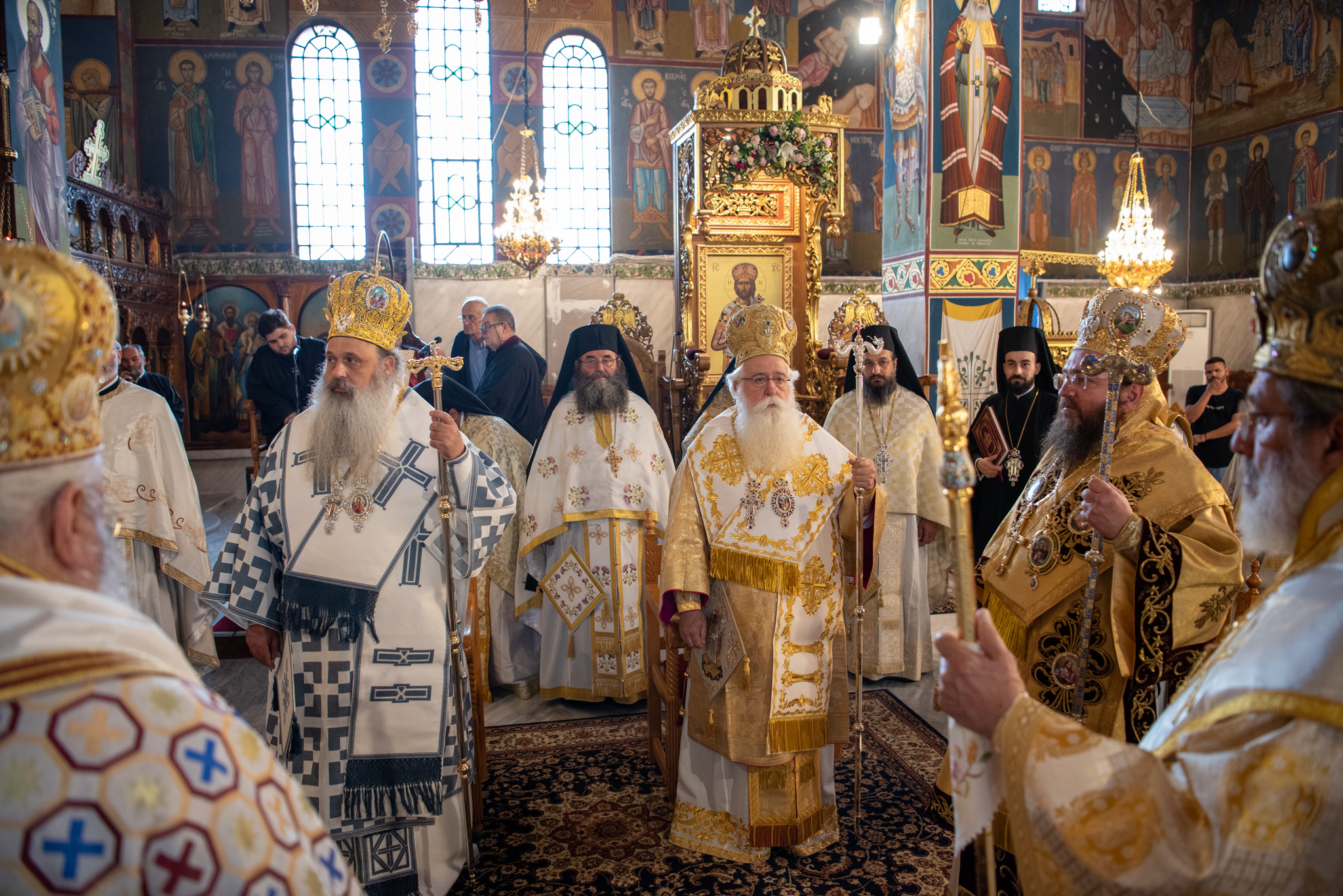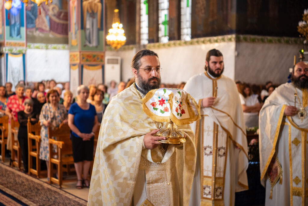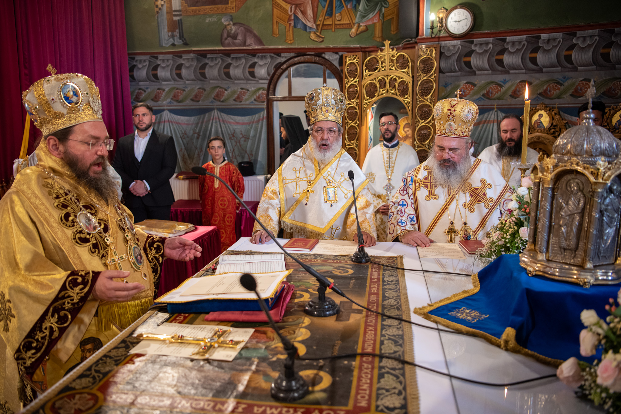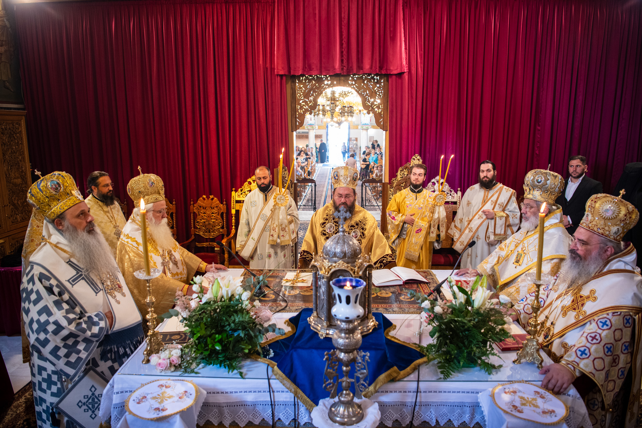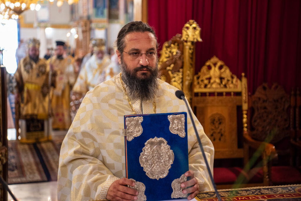 Του Όρθρου χοροστάτησε ο Σεβασμιώτατος Μητροπολίτης Σταγών και Μετεώρων κ. Θεόκλητος, ενώ της επακολουθησάσης πανηγυρικής πολυαρχιερατικής Θείας Λειτουργίας προέστη ο εορτάζων Μητροπολίτης κ. Βαρθολομαίος. Μαζί του συλλειτούργησαν οι Σεβ. Μητροπολίτες Δημητριάδος και Αλμυρού κ. Ιγνάτιος, Σιδηροκάστρου κ. Μακάριος, Σταγών κ. Θεόκλητος και Λαγκαδά, Λητής και Ρεντίνης κ. Πλάτων. Τους πλαισίωσαν Ιερείς και Διάκονοι με επικεφαλής τον Πρωτοσύγκελλο της τοπικής Μητροπόλεως Παν. Αρχιμ. Επιφάνιο Θεοδωρίδη.