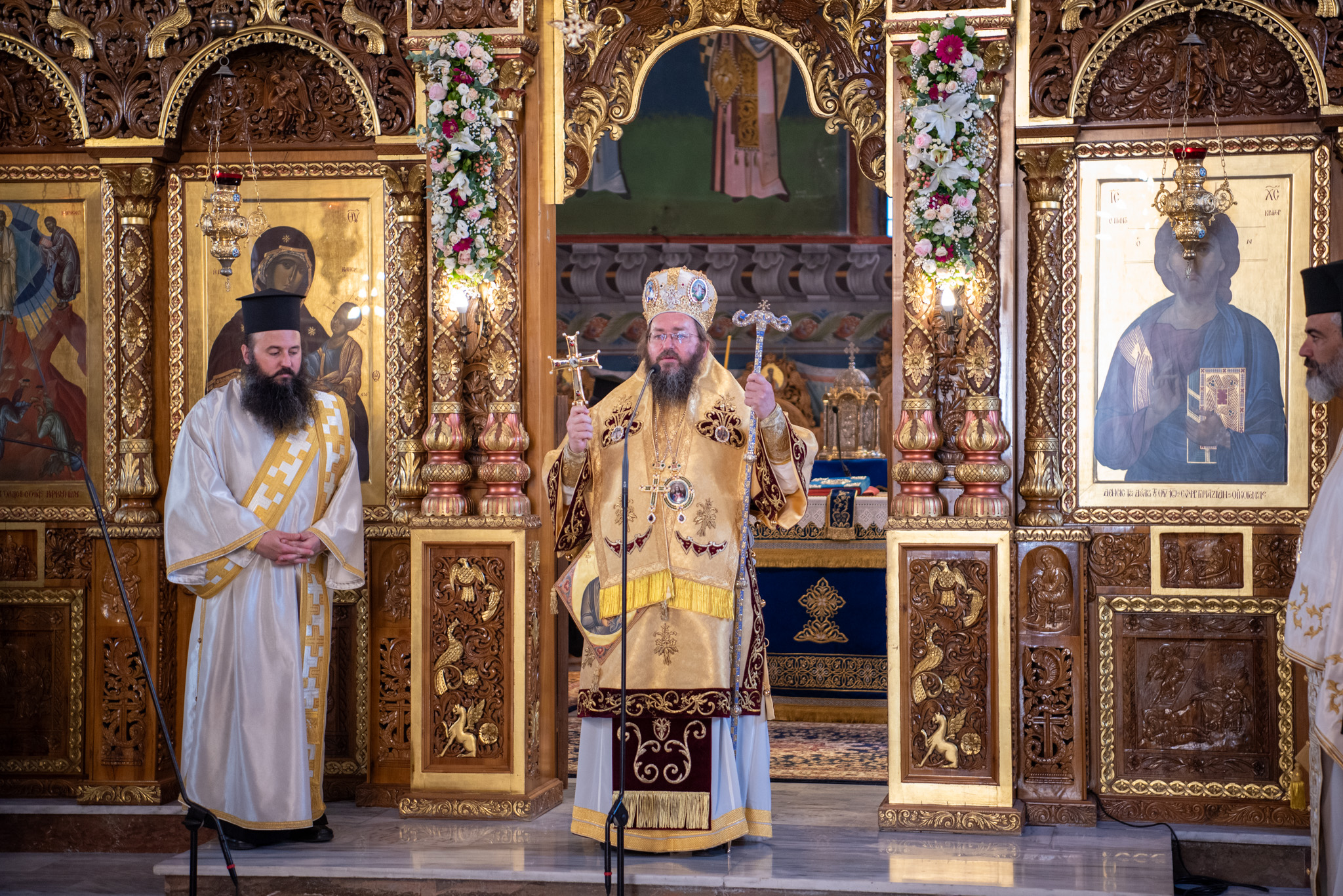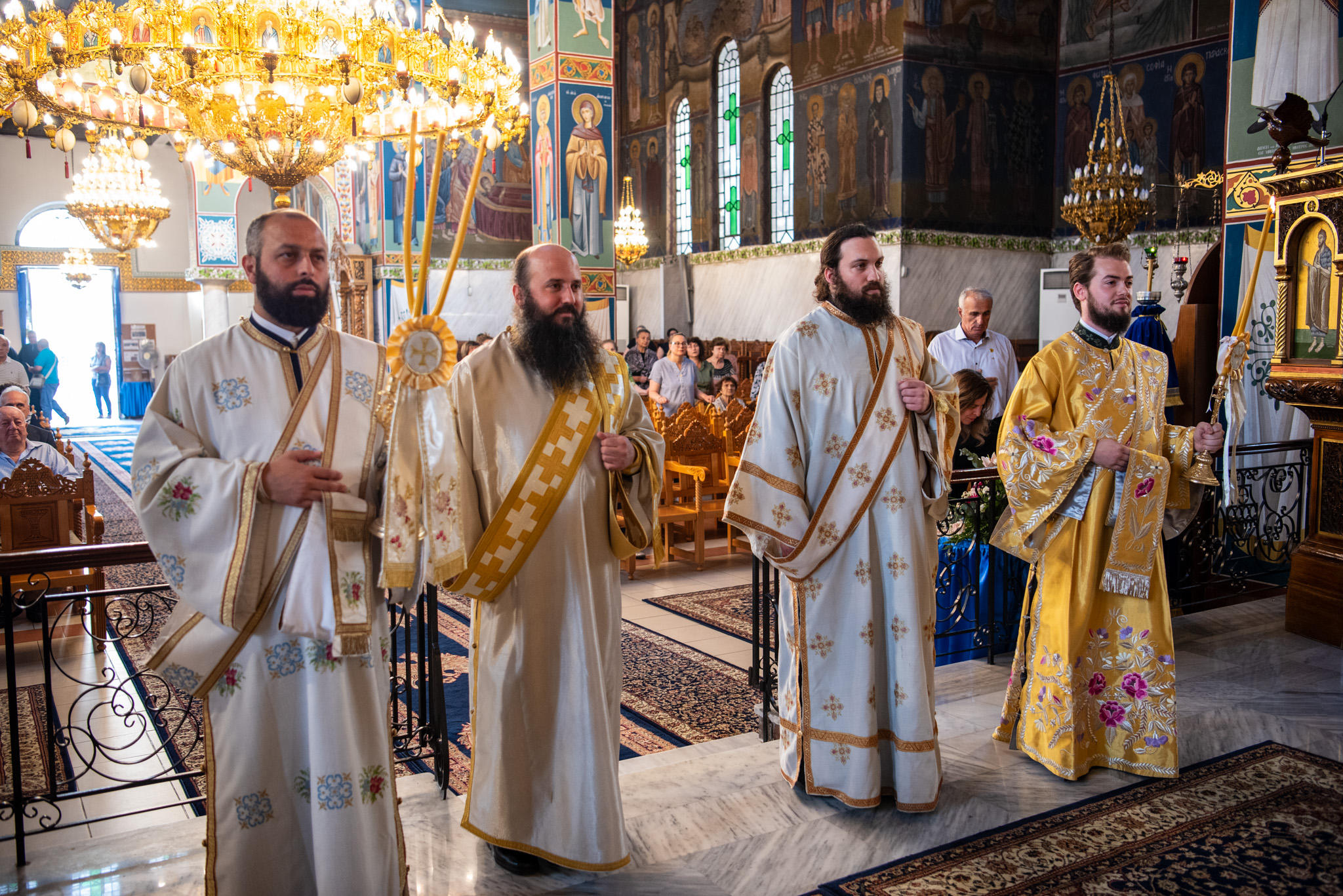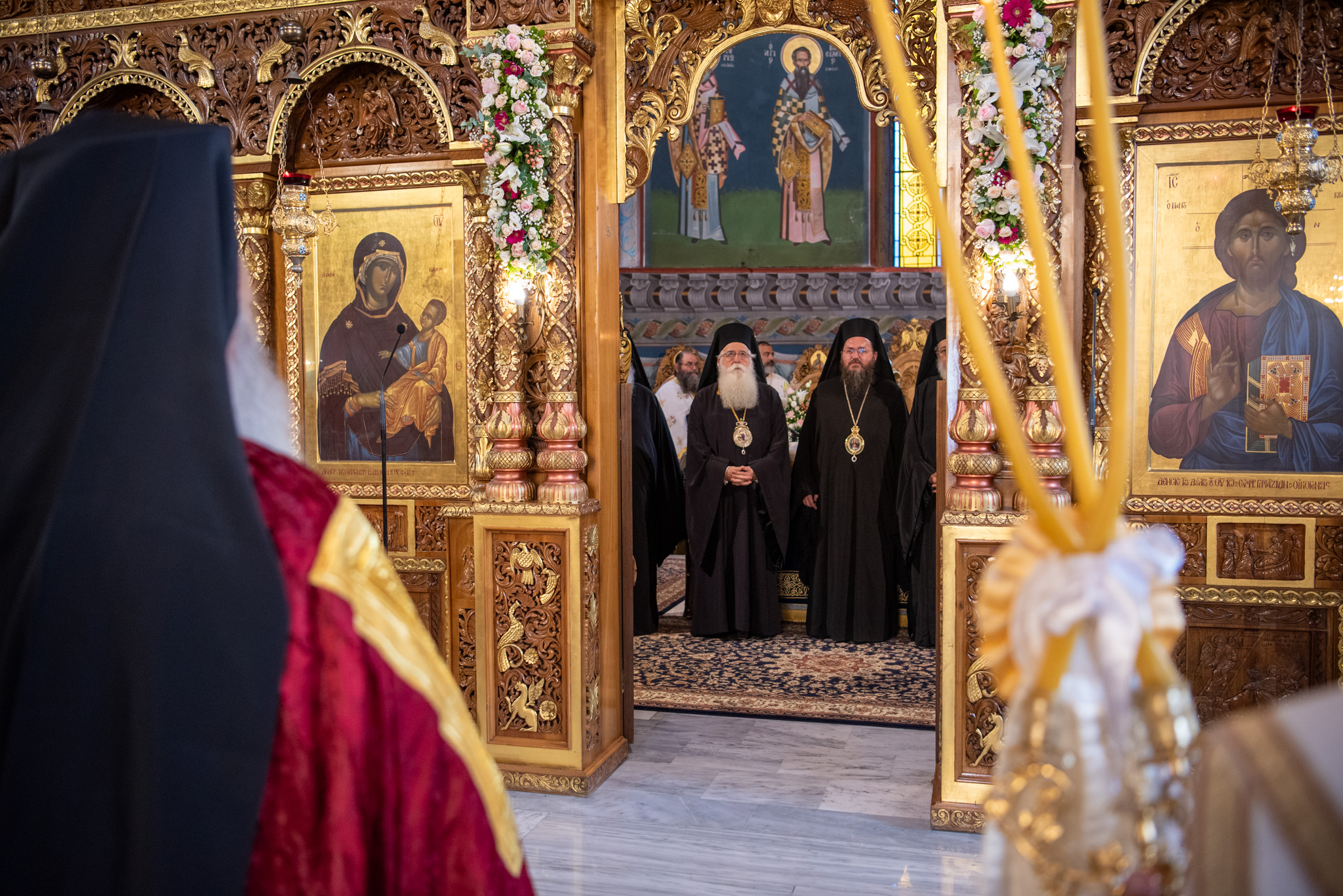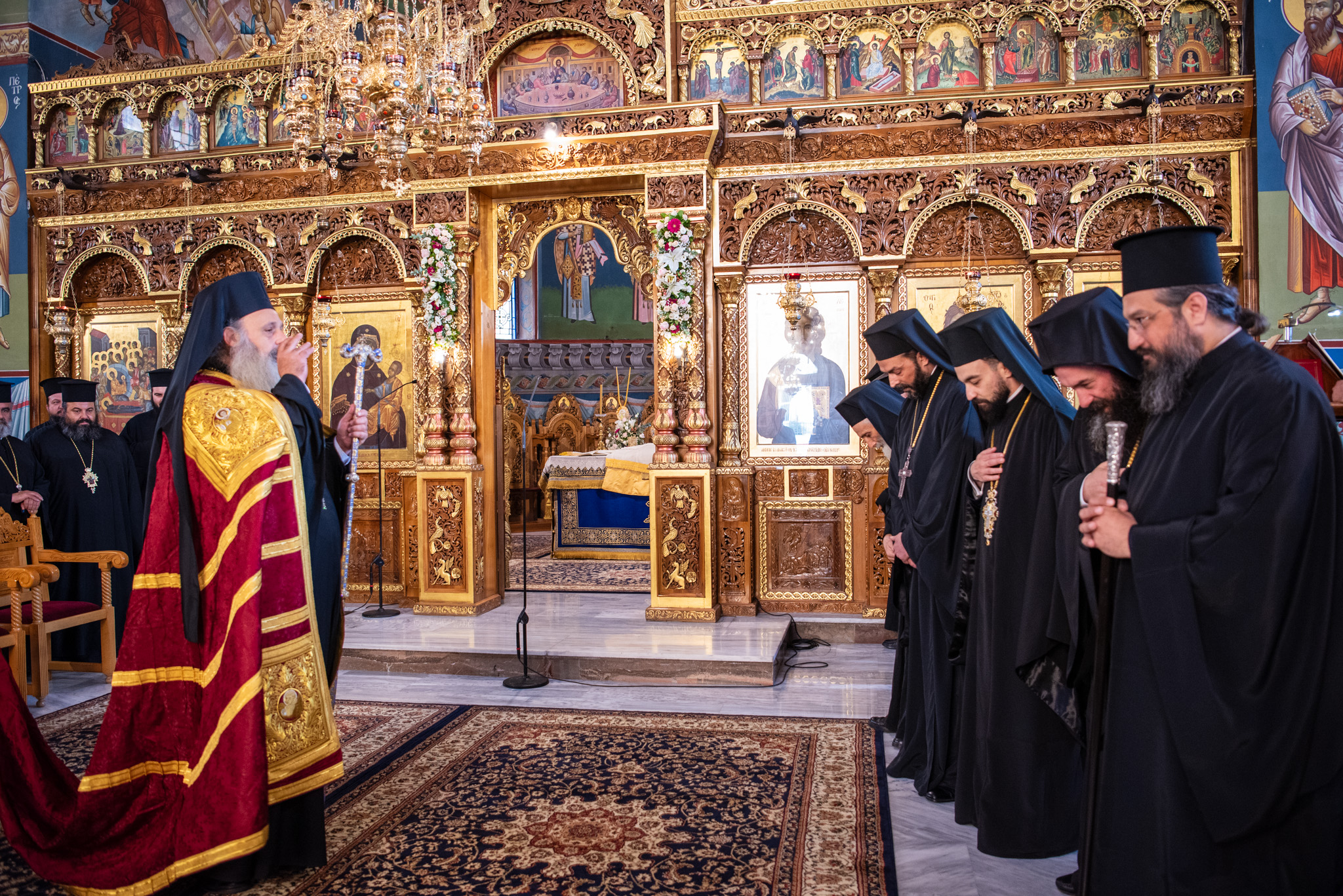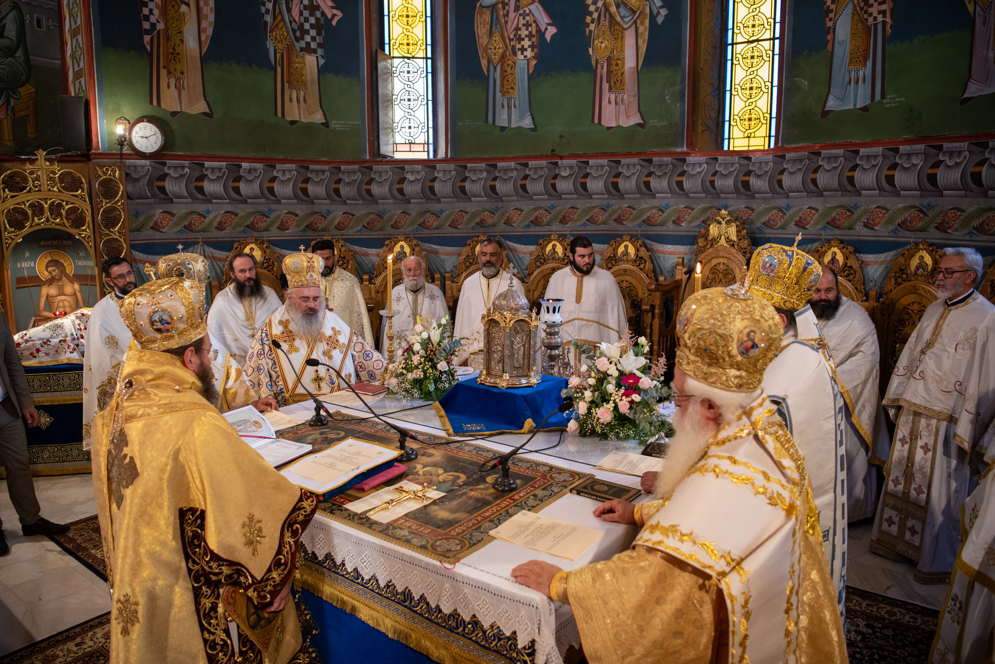 Του Όρθρου χοροστάτησε ο Σεβασμιώτατος Μητροπολίτης Σταγών και Μετεώρων κ. Θεόκλητος, ενώ της επακολουθησάσης πανηγυρικής πολυαρχιερατικής Θείας Λειτουργίας προέστη ο εορτάζων Μητροπολίτης κ. Βαρθολομαίος. Μαζί του συλλειτούργησαν οι Σεβ. Μητροπολίτες Δημητριάδος και Αλμυρού κ. Ιγνάτιος, Σιδηροκάστρου κ. Μακάριος, Σταγών κ. Θεόκλητος και Λαγκαδά, Λητής και Ρεντίνης κ. Πλάτων. Τους πλαισίωσαν Ιερείς και Διάκονοι με επικεφαλής τον Πρωτοσύγκελλο της τοπικής Μητροπόλεως Παν. Αρχιμ. Επιφάνιο Θεοδωρίδη.