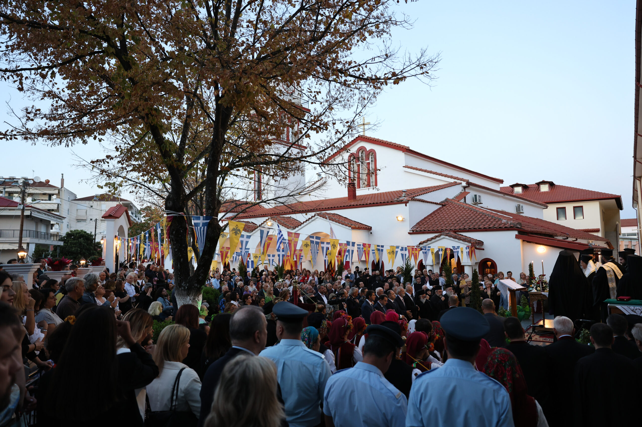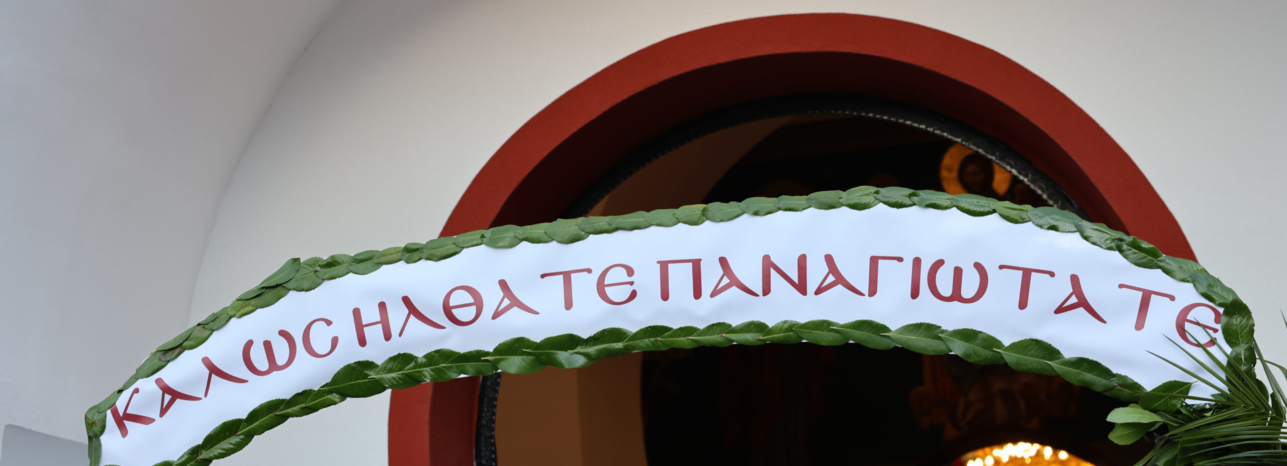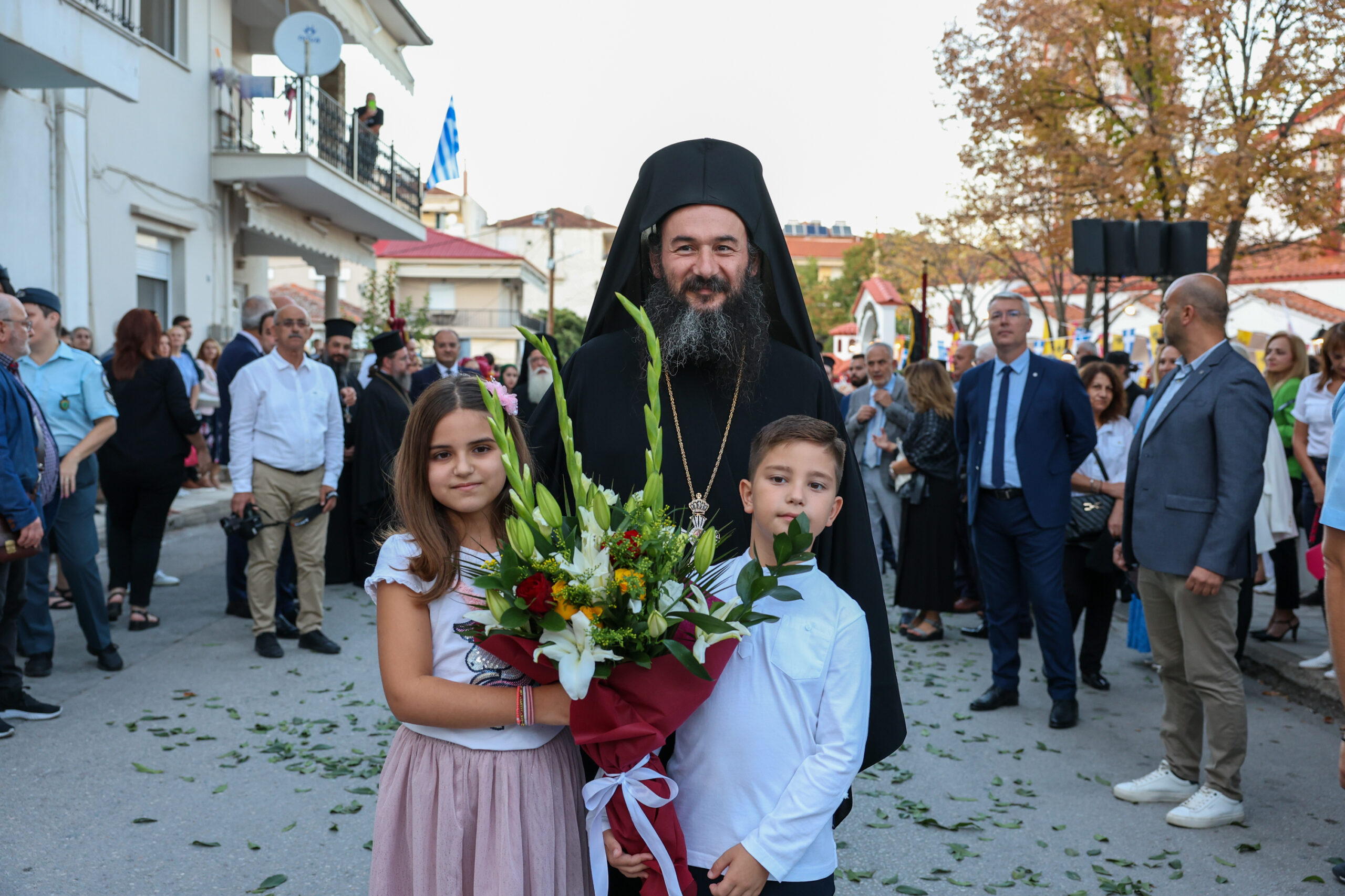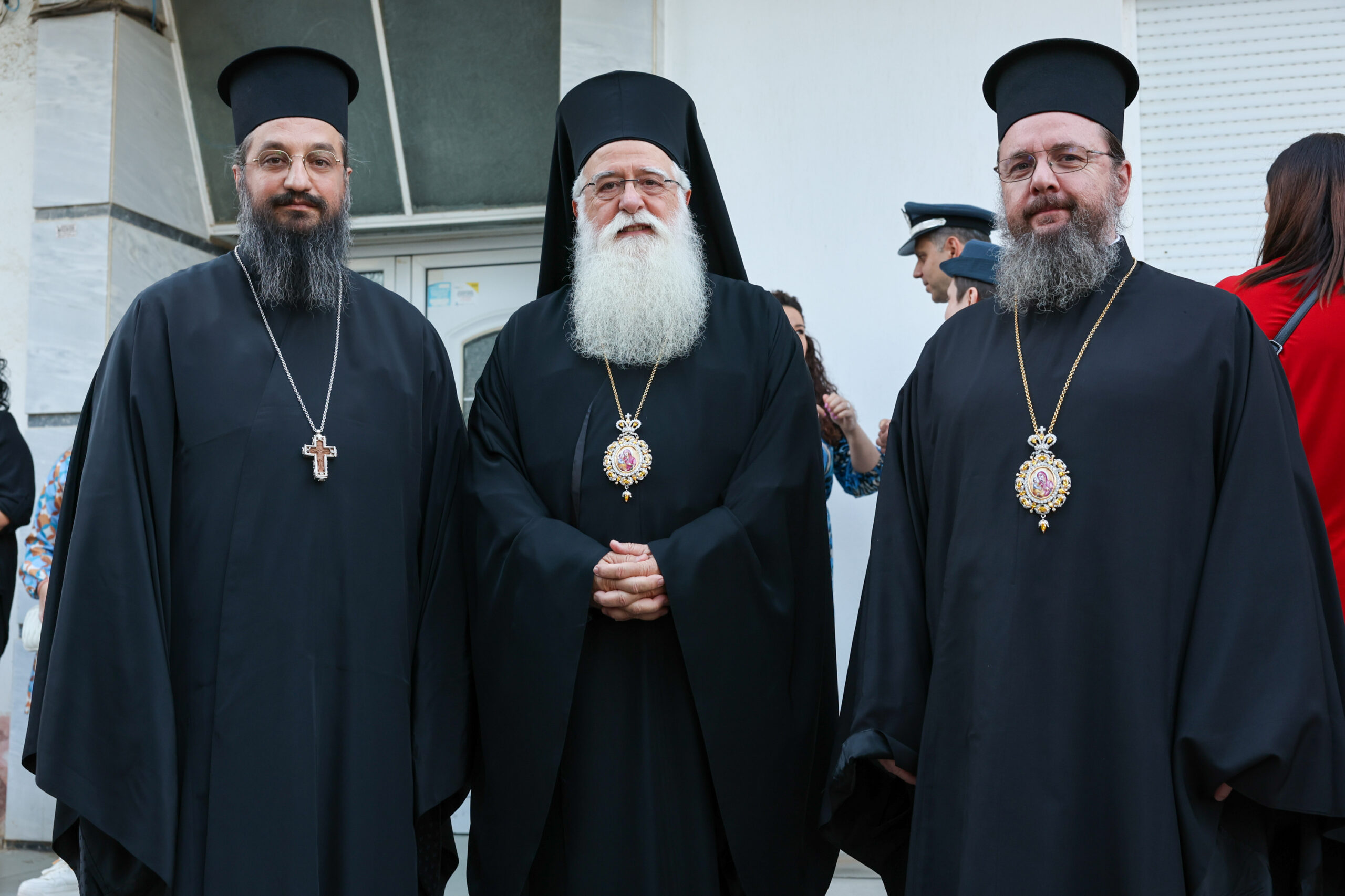 Στον ανακαινισμένο προαύλειο χώρο του Ιερού Ναού έγινε δεκτός από πλήθος ευσεβών πιστών, μεταξύ των οποίων πολλών μικρών παιδιών και νέων, που έσπευσαν να λάβουν την ευχή του και να ακούσουν τον πατρικό του λόγο.