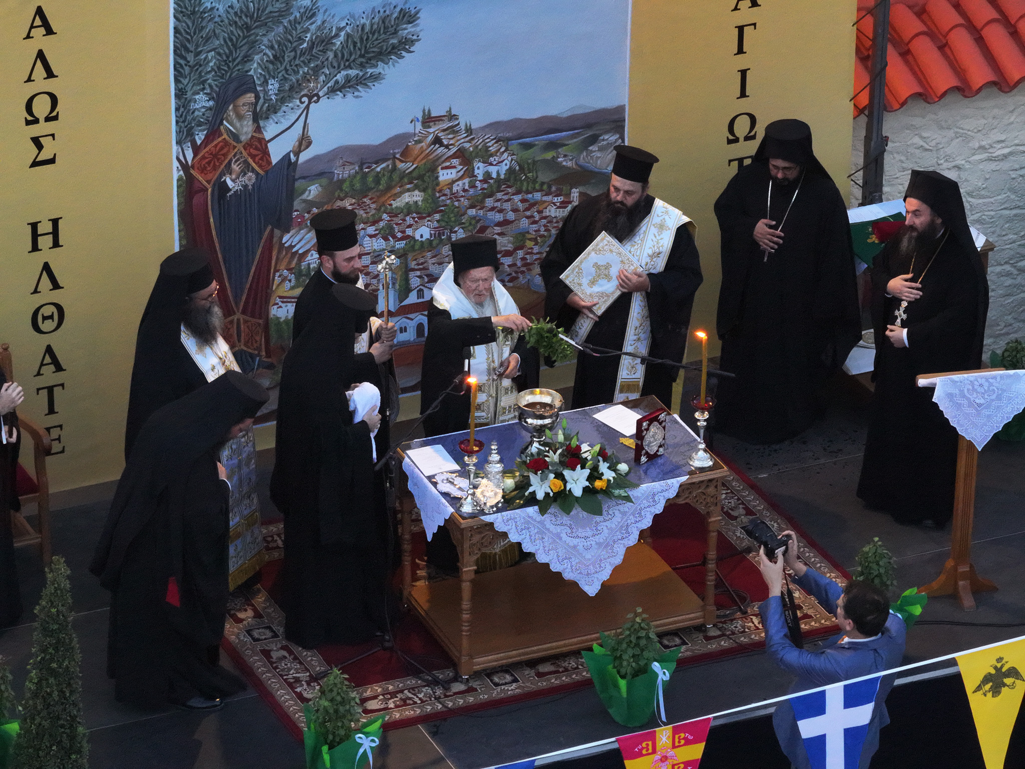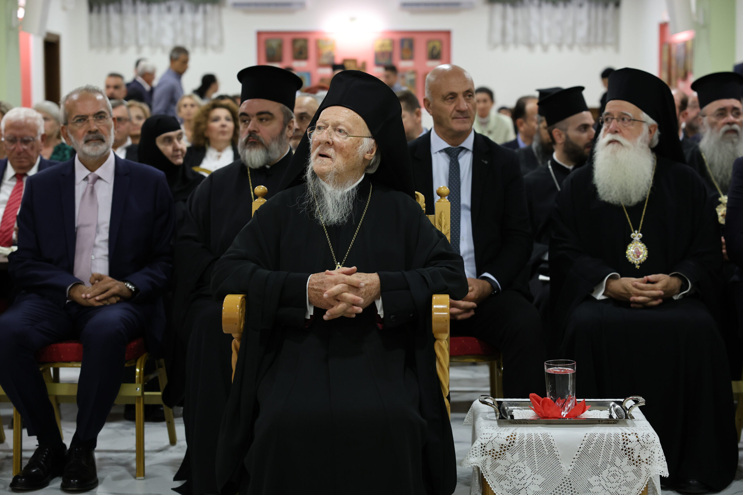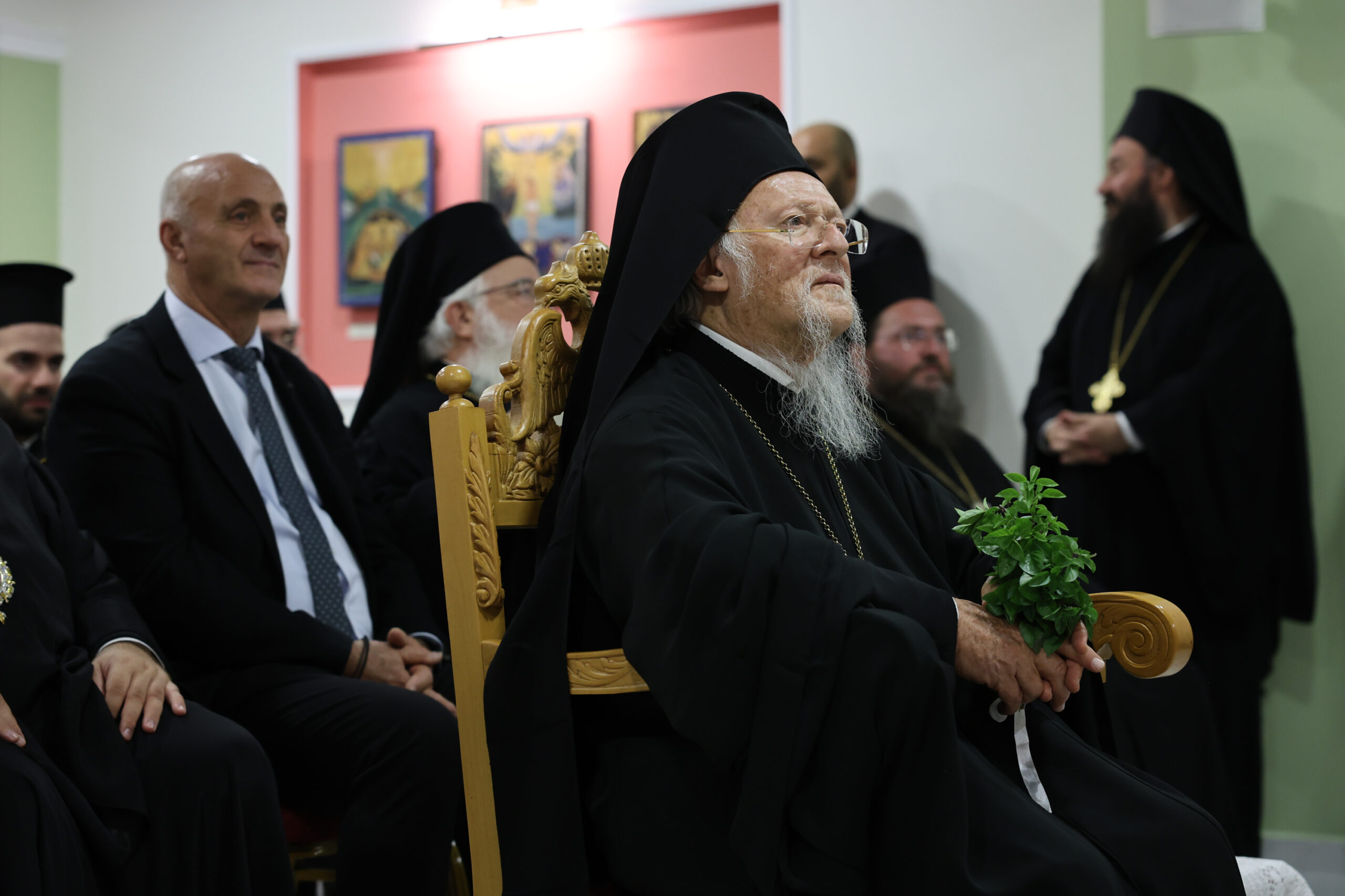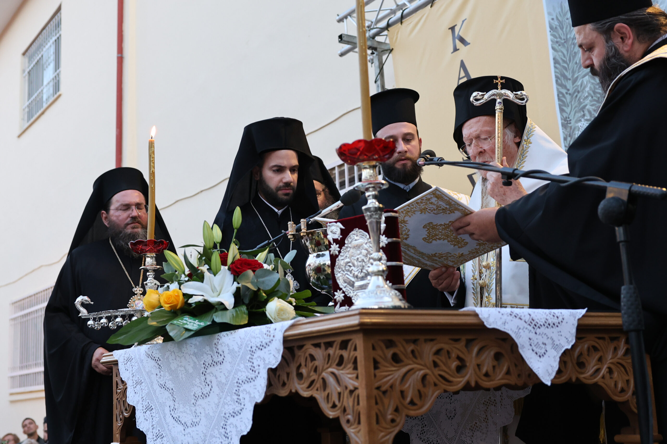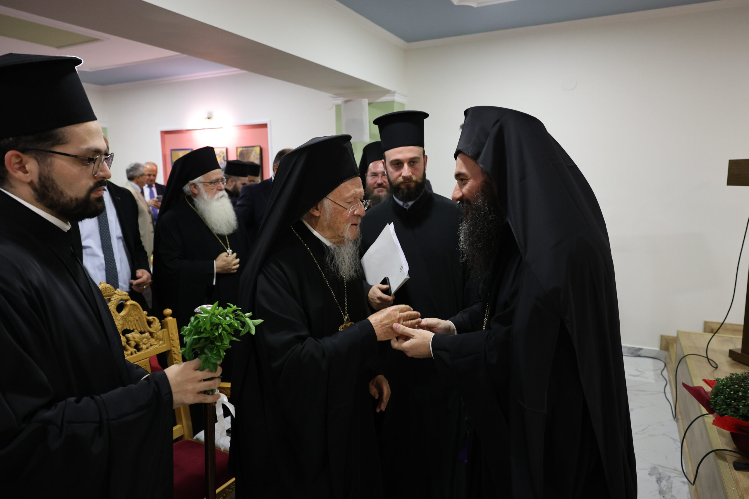 Εν συνεχεία ο Προϊστάμενος του Ναού και Πρωτοσύγκελλος της τοπικής Μητροπόλεως Παν. Αρχιμ. π. Επιφάνιος Θεοδωρίδης καλωσόρισε θερμά τον Οικουμενικό Πατριάρχη διερμηνεύοντας τα αισθήματα όλων των ενοριτών και παρουσίασε την συνοπτικά την ιστορία του Ναού από τον ερχομό των προσφύγων έως σήμερα καθώς και τις δράσεις που επιτελεί η Ενορία στο ποιμαντικό και φιλανθρωπικό της έργο, υπό την καθοδήγηση του Ποιμενάρχου κ Βαρθολομαίου.