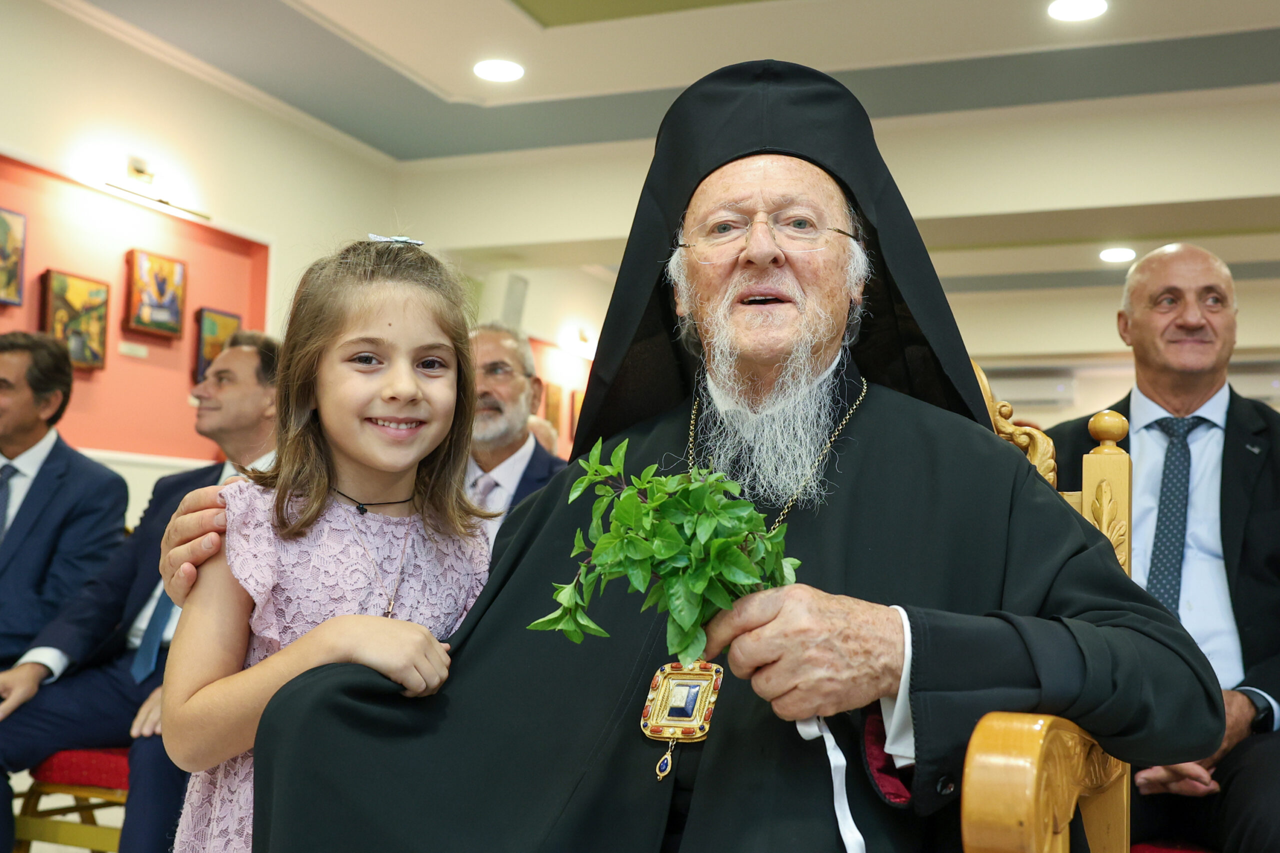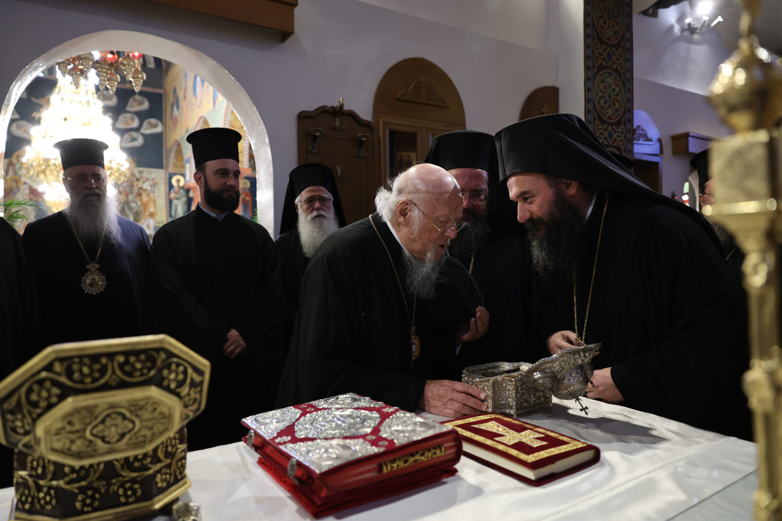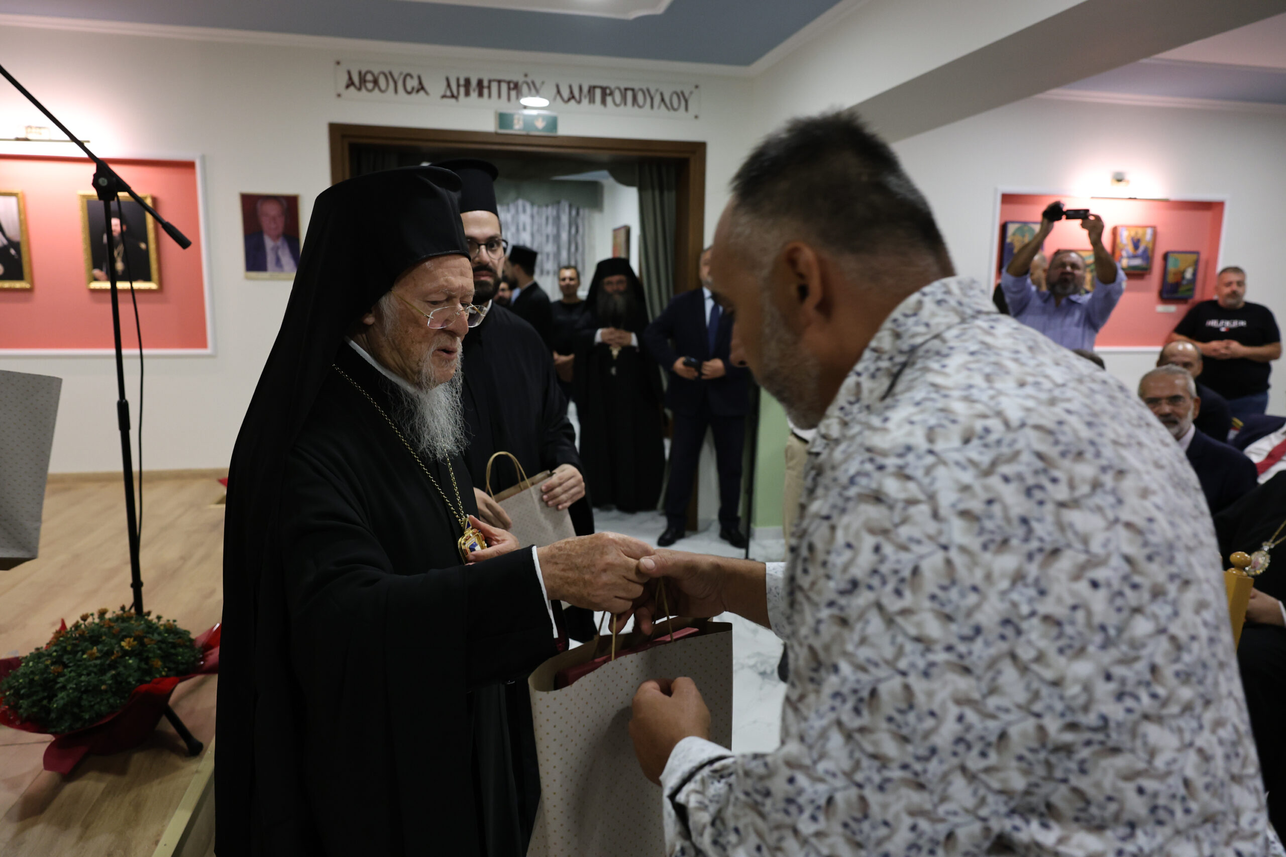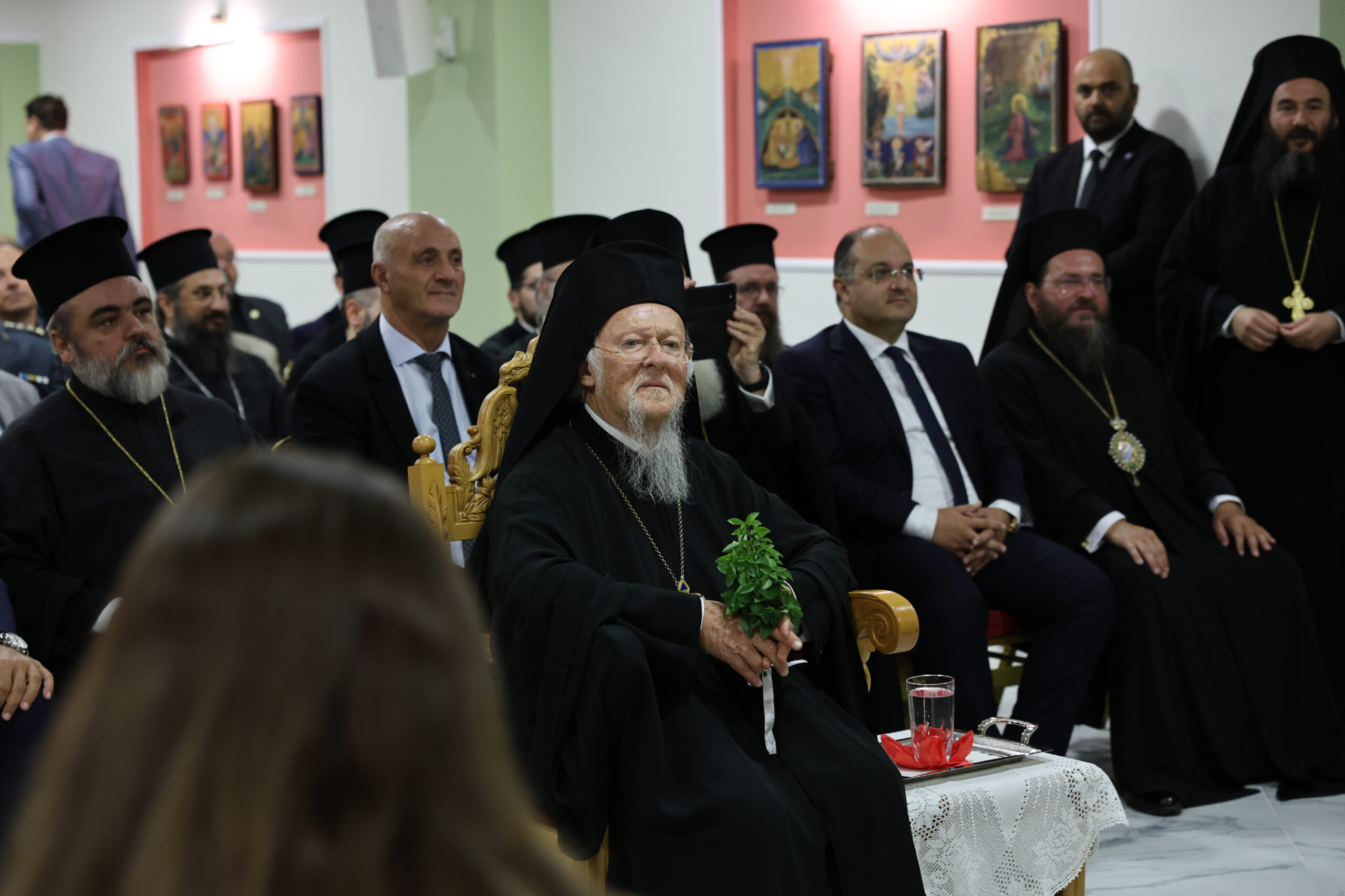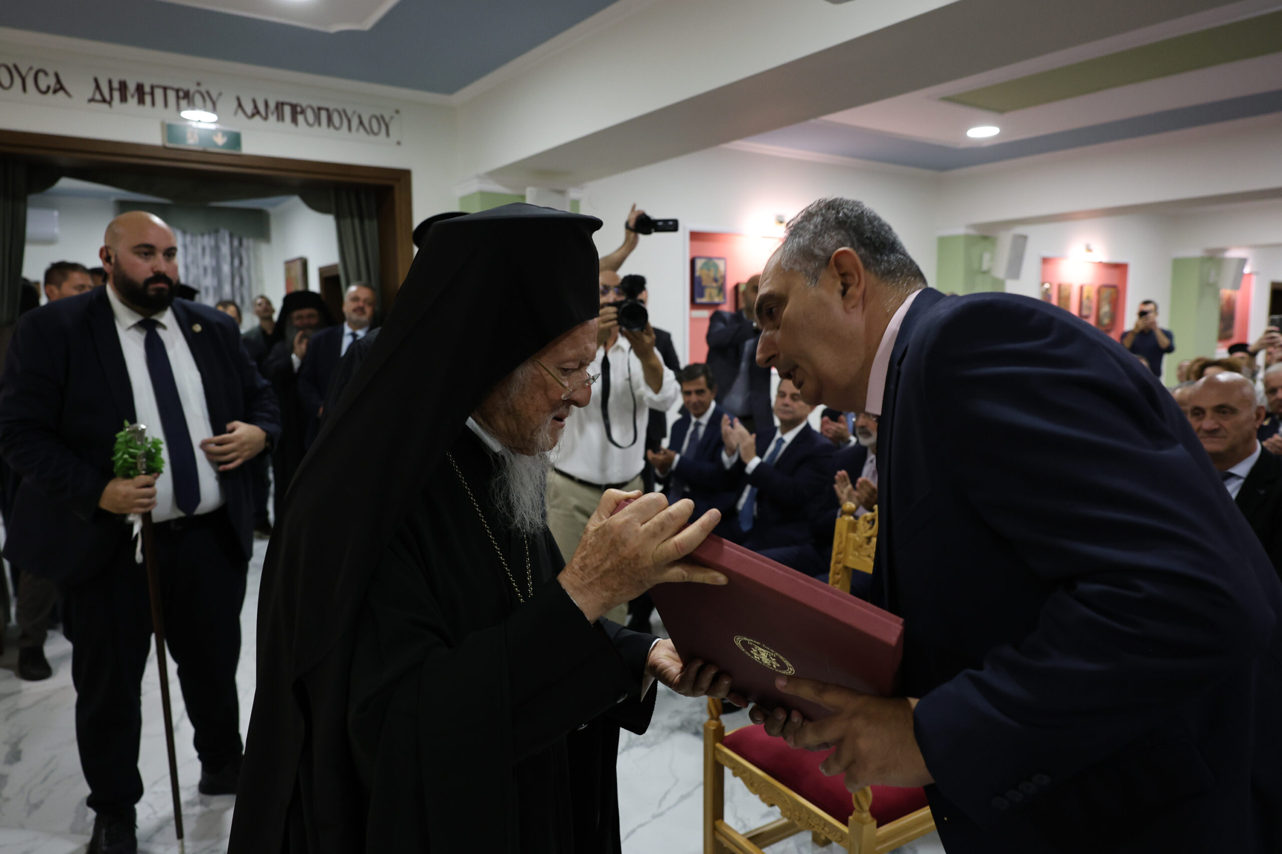 Εν συνεχεία ο Προϊστάμενος του Ναού και Πρωτοσύγκελλος της τοπικής Μητροπόλεως Παν. Αρχιμ. π. Επιφάνιος Θεοδωρίδης καλωσόρισε θερμά τον Οικουμενικό Πατριάρχη διερμηνεύοντας τα αισθήματα όλων των ενοριτών και παρουσίασε την συνοπτικά την ιστορία του Ναού από τον ερχομό των προσφύγων έως σήμερα καθώς και τις δράσεις που επιτελεί η Ενορία στο ποιμαντικό και φιλανθρωπικό της έργο, υπό την καθοδήγηση του Ποιμενάρχου κ Βαρθολομαίου.