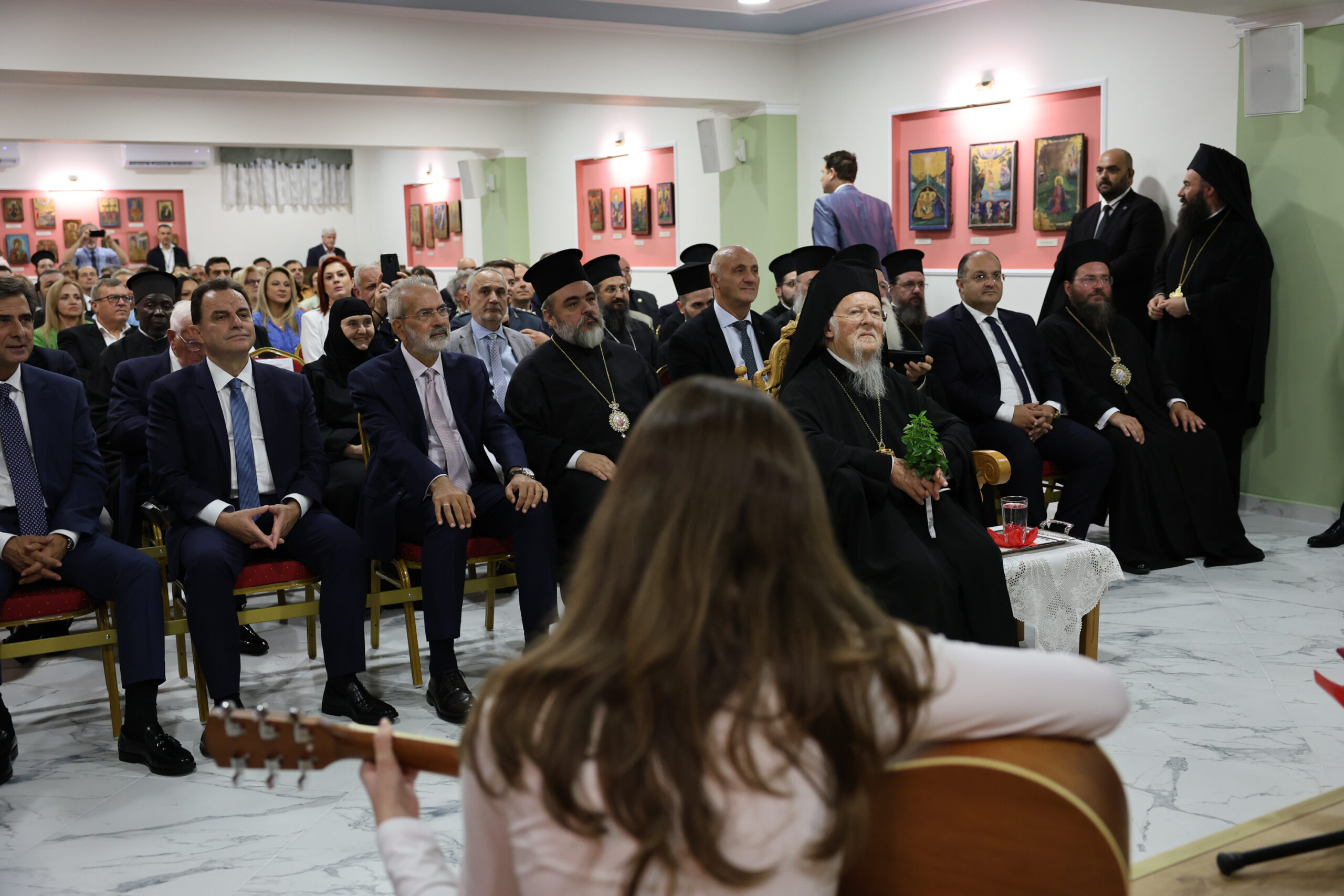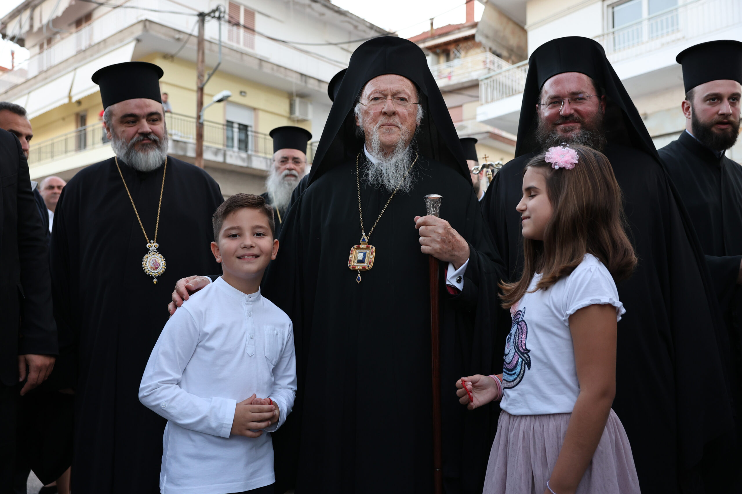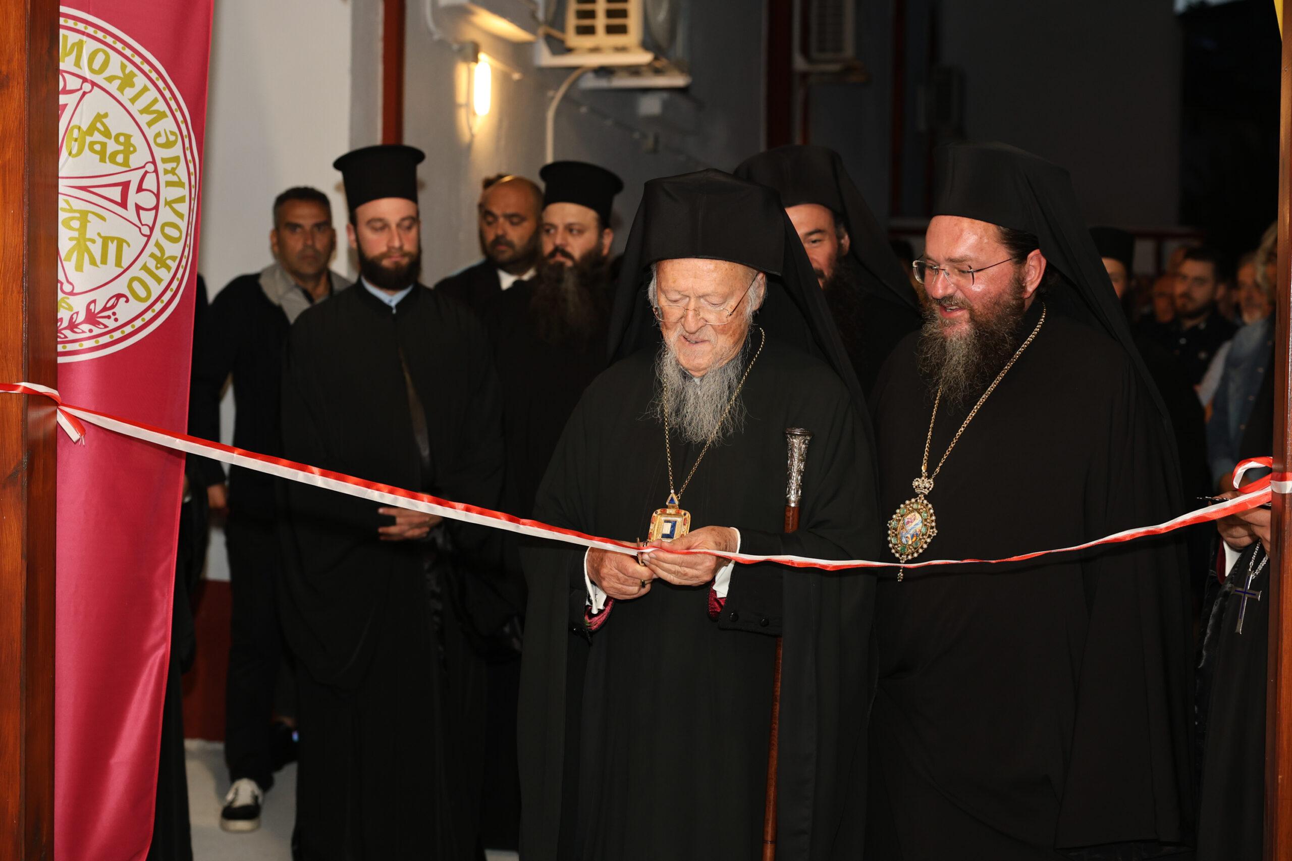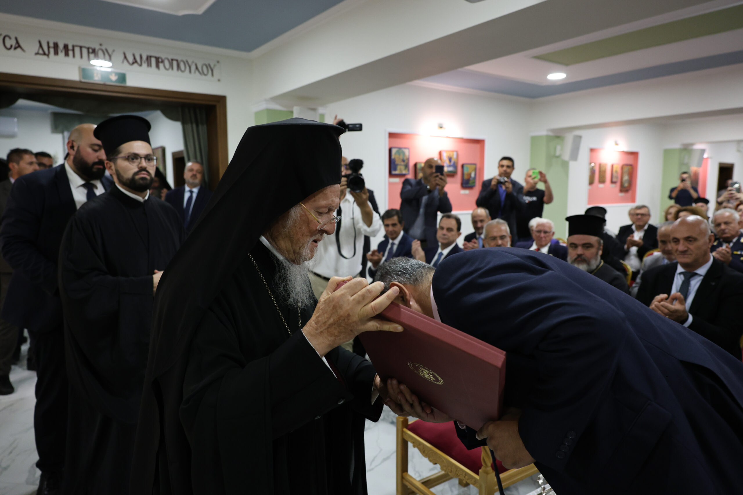 Εν συνεχεία ο Προϊστάμενος του Ναού και Πρωτοσύγκελλος της τοπικής Μητροπόλεως Παν. Αρχιμ. π. Επιφάνιος Θεοδωρίδης καλωσόρισε θερμά τον Οικουμενικό Πατριάρχη διερμηνεύοντας τα αισθήματα όλων των ενοριτών και παρουσίασε την συνοπτικά την ιστορία του Ναού από τον ερχομό των προσφύγων έως σήμερα καθώς και τις δράσεις που επιτελεί η Ενορία στο ποιμαντικό και φιλανθρωπικό της έργο, υπό την καθοδήγηση του Ποιμενάρχου κ Βαρθολομαίου.