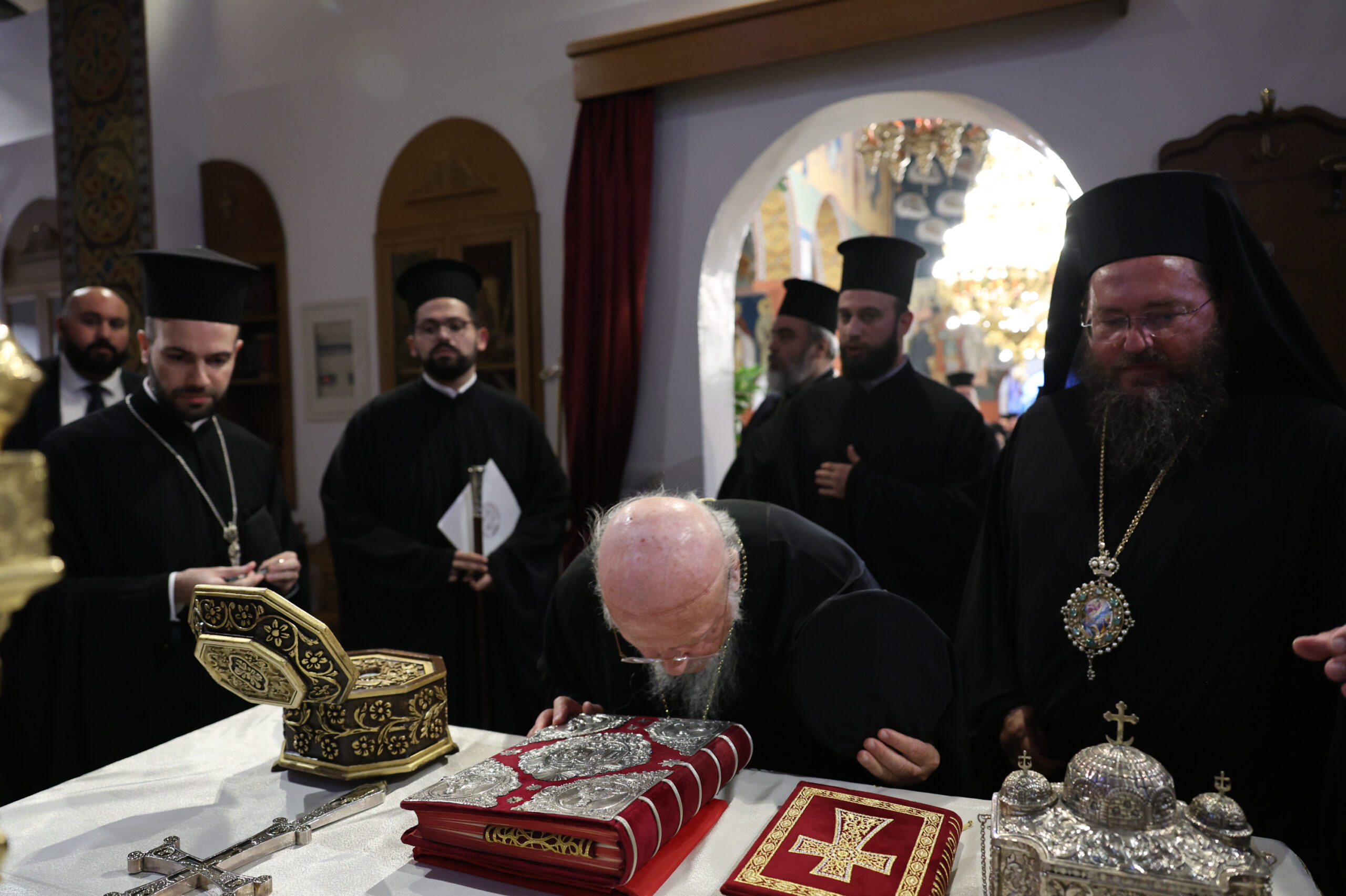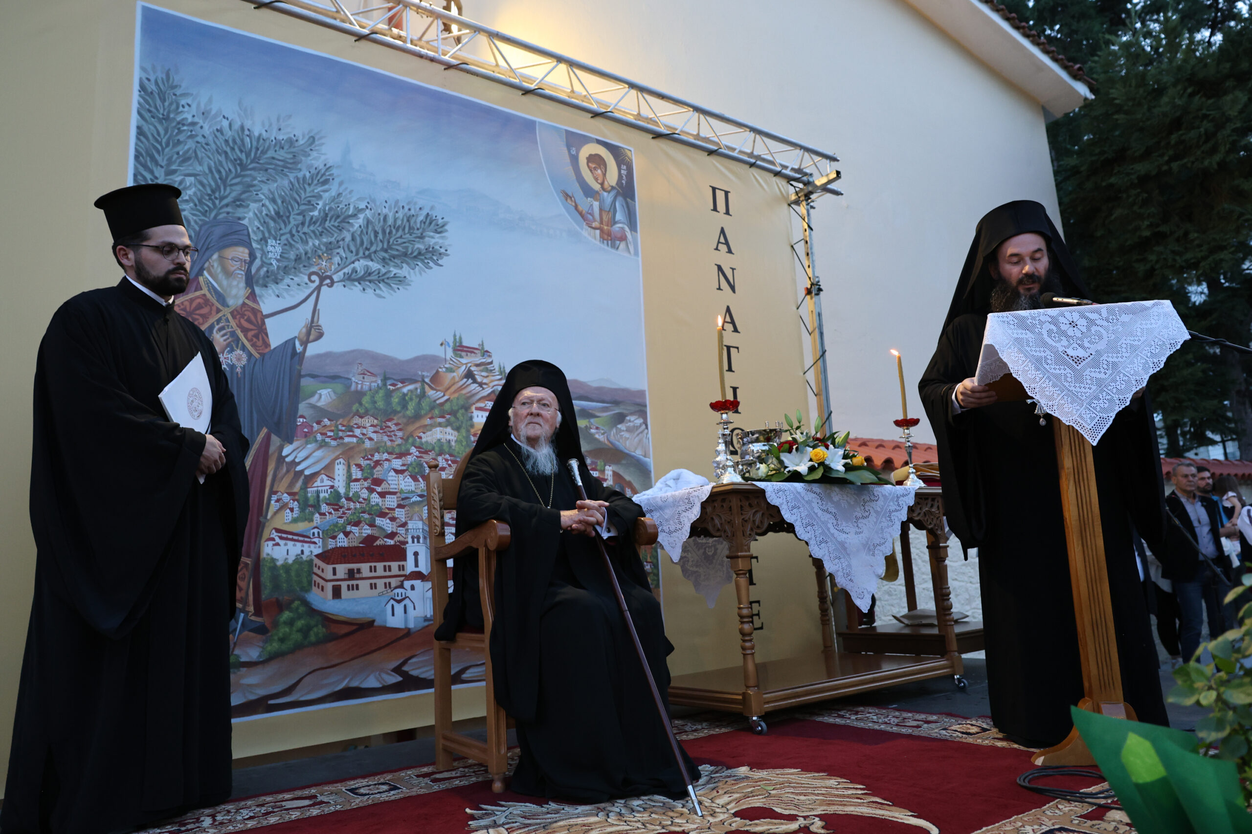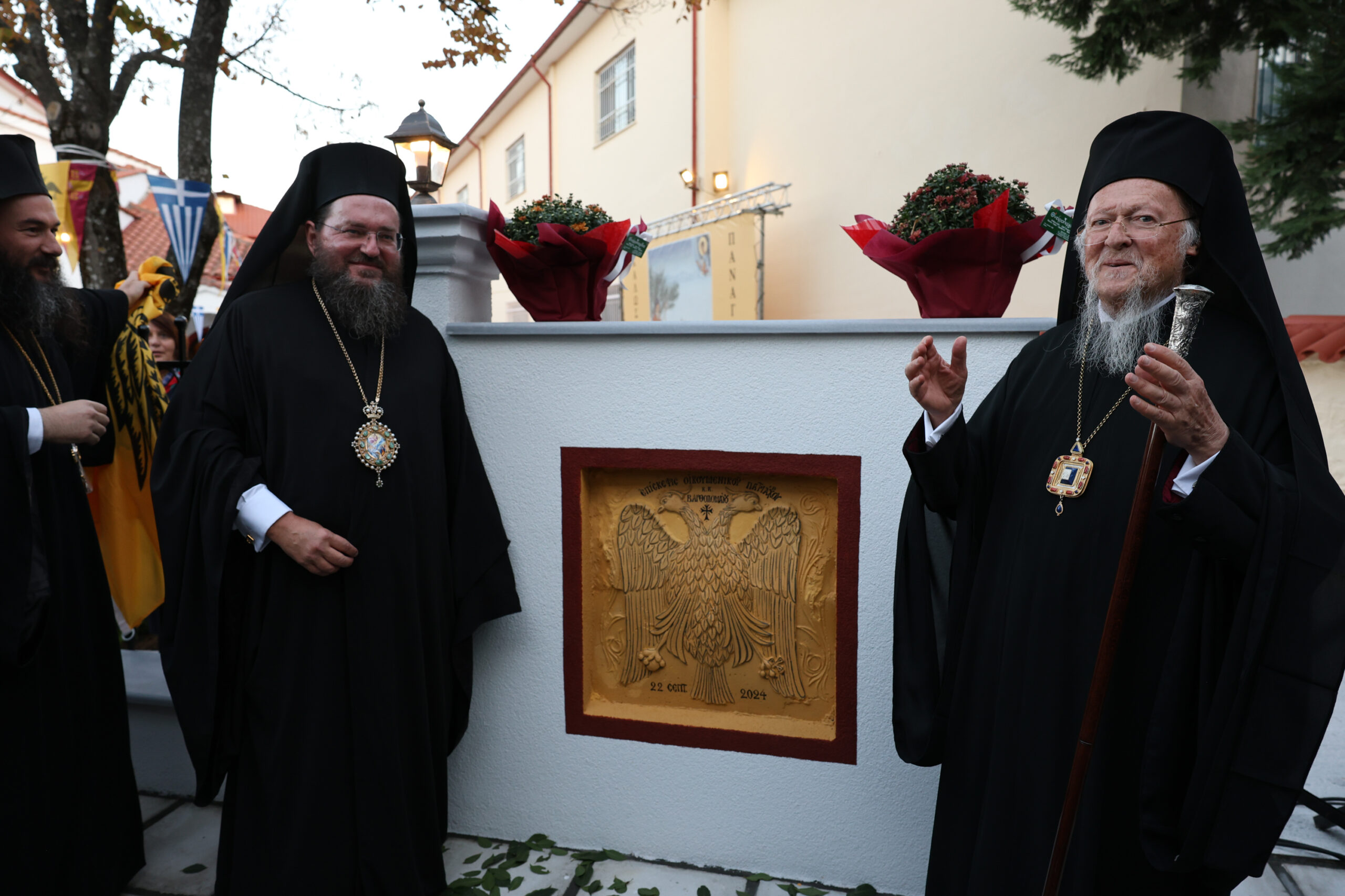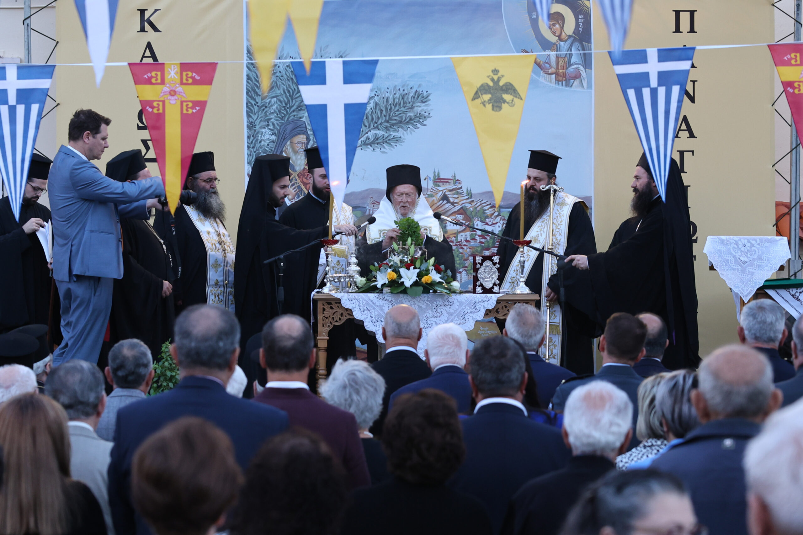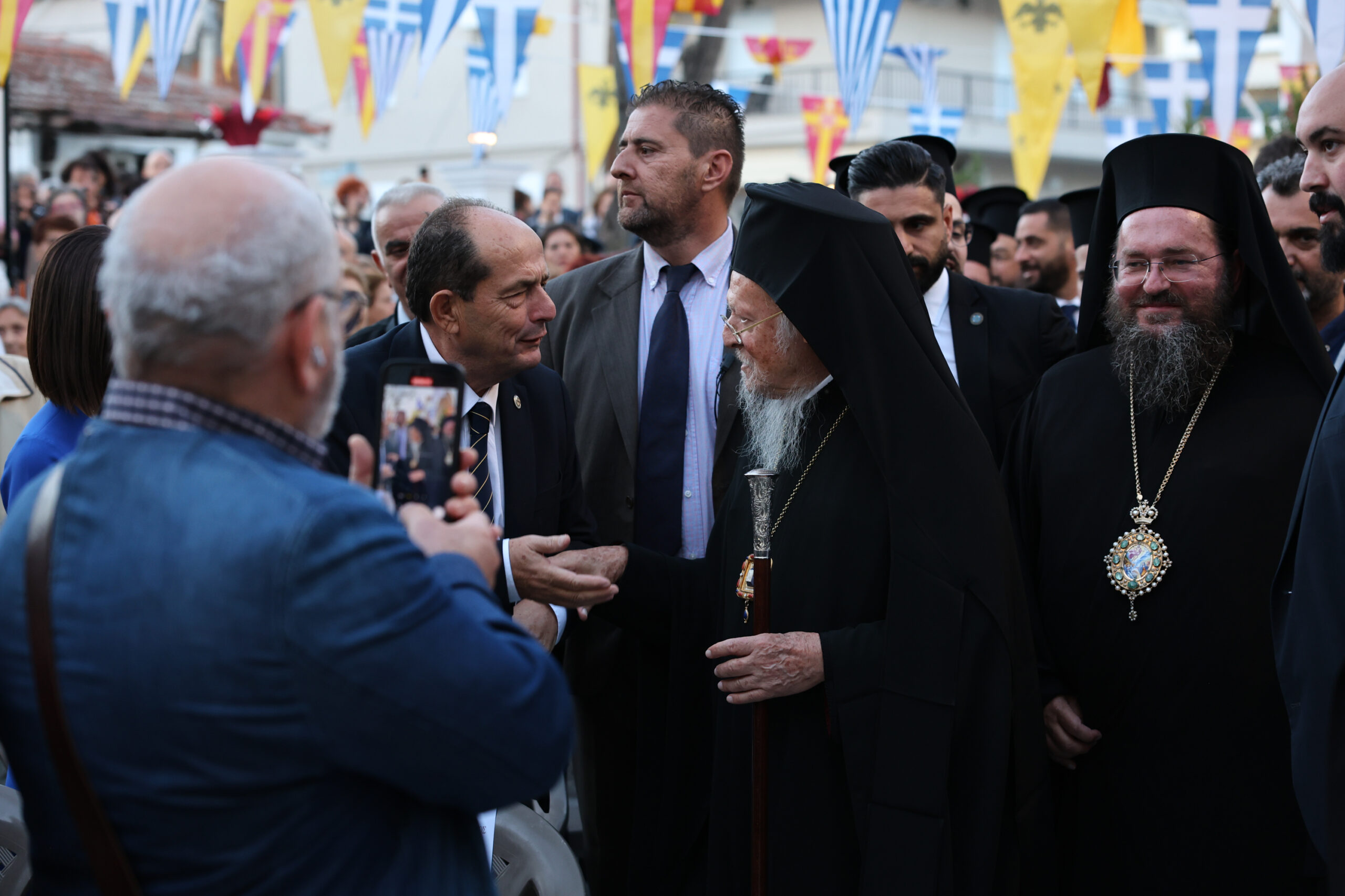 Εν συνεχεία ο Προϊστάμενος του Ναού και Πρωτοσύγκελλος της τοπικής Μητροπόλεως Παν. Αρχιμ. π. Επιφάνιος Θεοδωρίδης καλωσόρισε θερμά τον Οικουμενικό Πατριάρχη διερμηνεύοντας τα αισθήματα όλων των ενοριτών και παρουσίασε την συνοπτικά την ιστορία του Ναού από τον ερχομό των προσφύγων έως σήμερα καθώς και τις δράσεις που επιτελεί η Ενορία στο ποιμαντικό και φιλανθρωπικό της έργο, υπό την καθοδήγηση του Ποιμενάρχου κ Βαρθολομαίου.