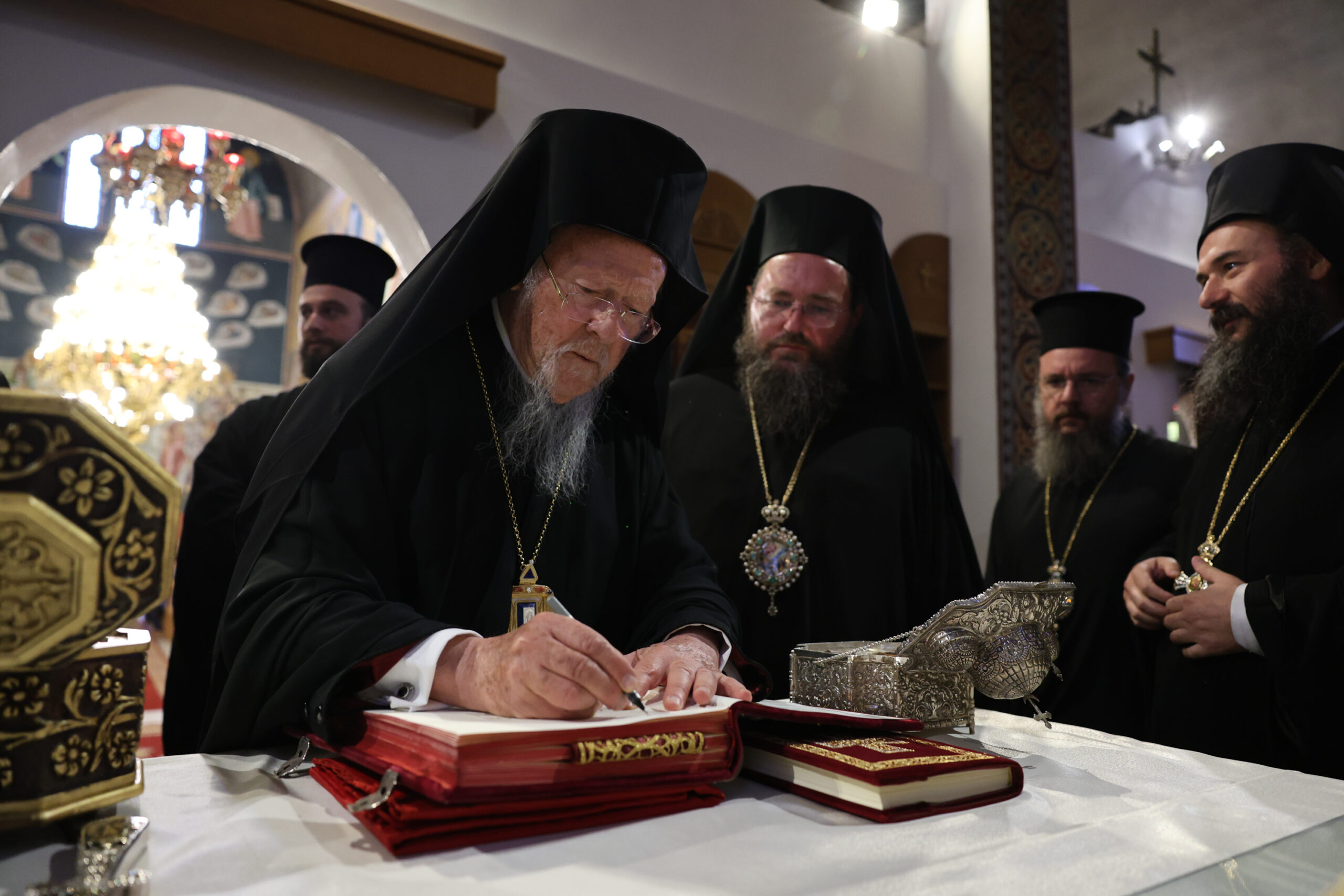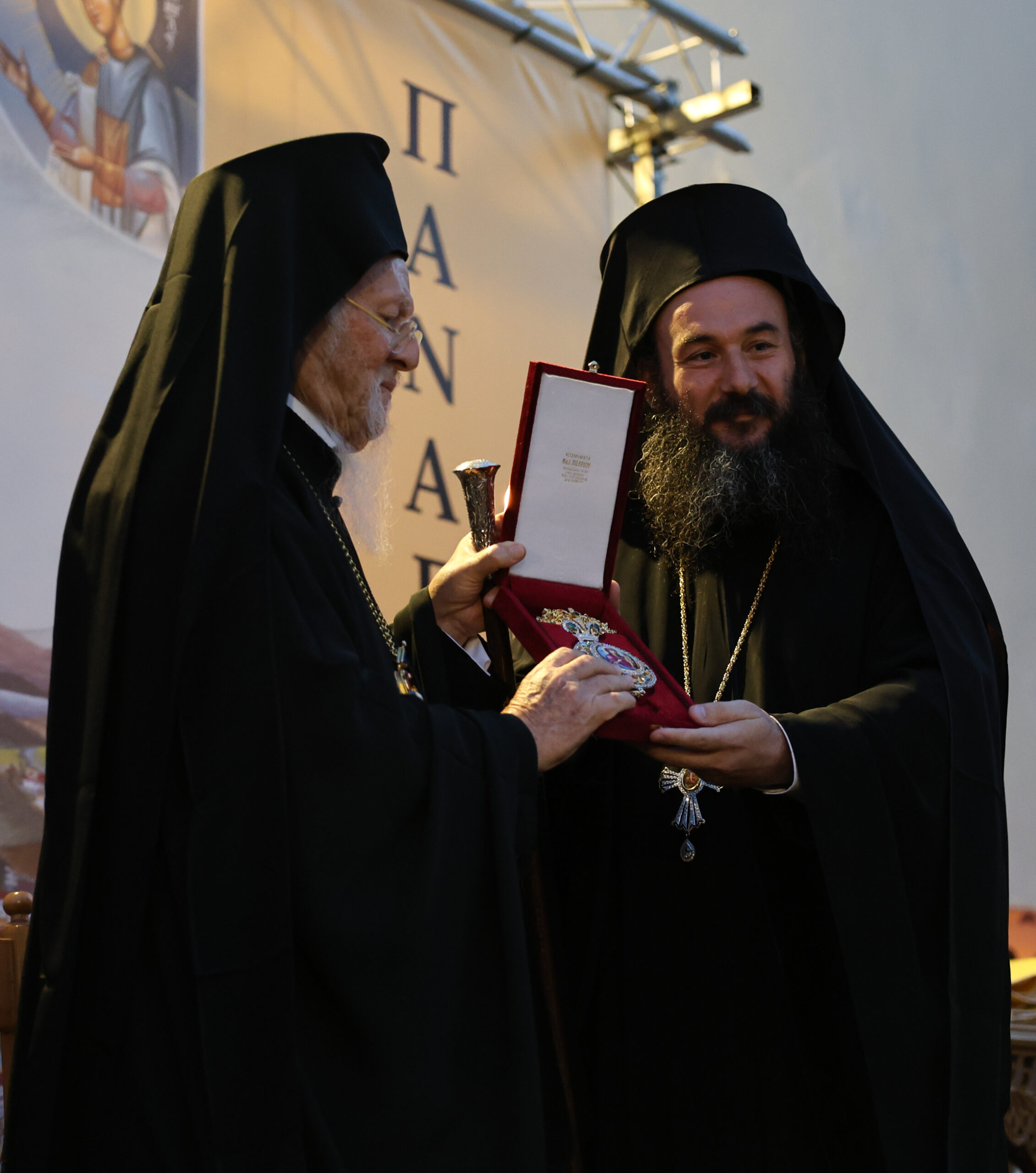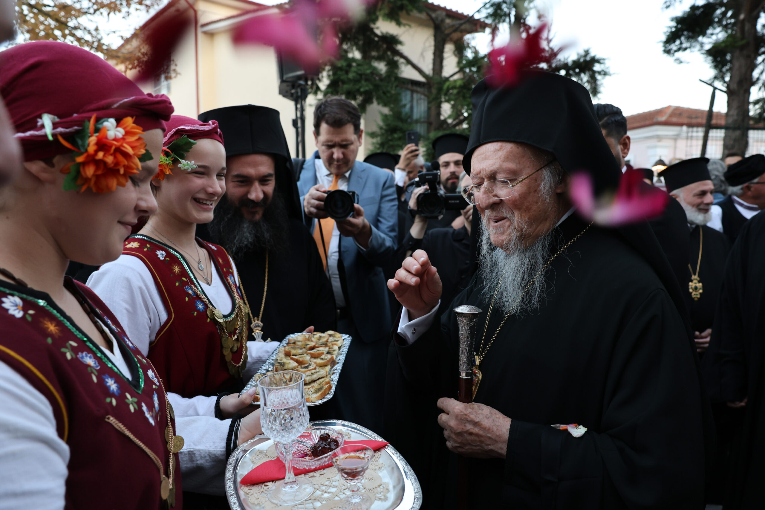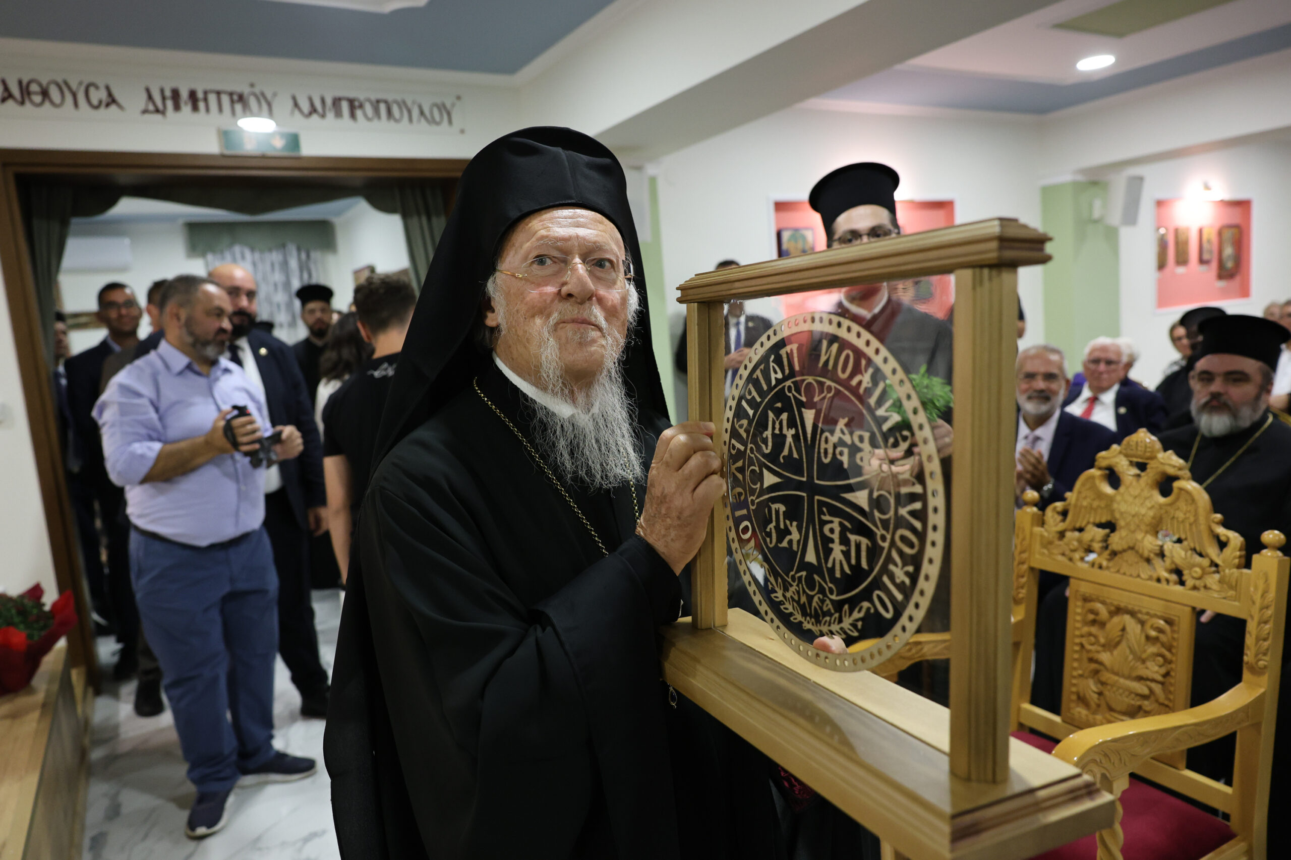 Εν συνεχεία ο Προϊστάμενος του Ναού και Πρωτοσύγκελλος της τοπικής Μητροπόλεως Παν. Αρχιμ. π. Επιφάνιος Θεοδωρίδης καλωσόρισε θερμά τον Οικουμενικό Πατριάρχη διερμηνεύοντας τα αισθήματα όλων των ενοριτών και παρουσίασε την συνοπτικά την ιστορία του Ναού από τον ερχομό των προσφύγων έως σήμερα καθώς και τις δράσεις που επιτελεί η Ενορία στο ποιμαντικό και φιλανθρωπικό της έργο, υπό την καθοδήγηση του Ποιμενάρχου κ Βαρθολομαίου.