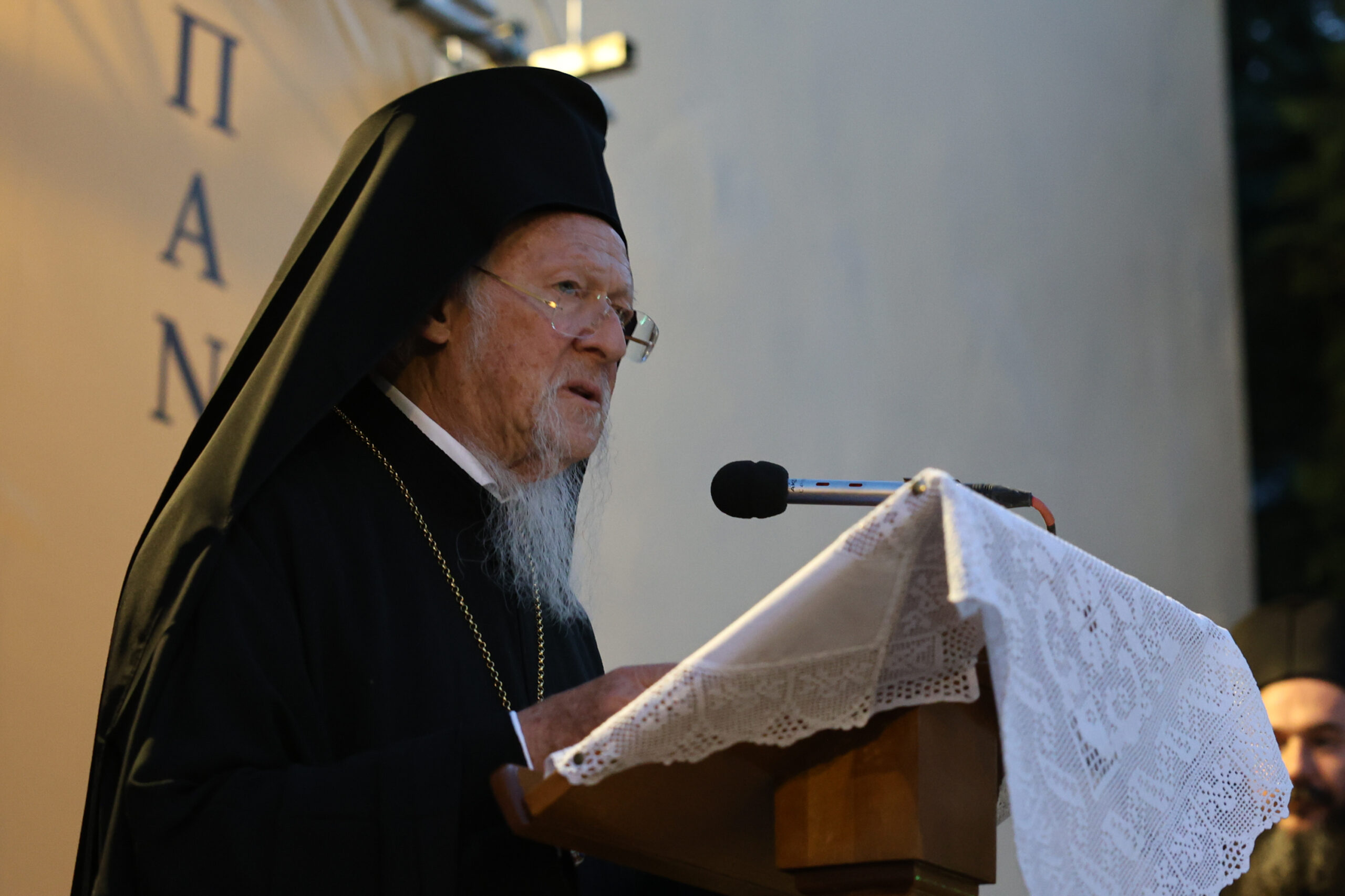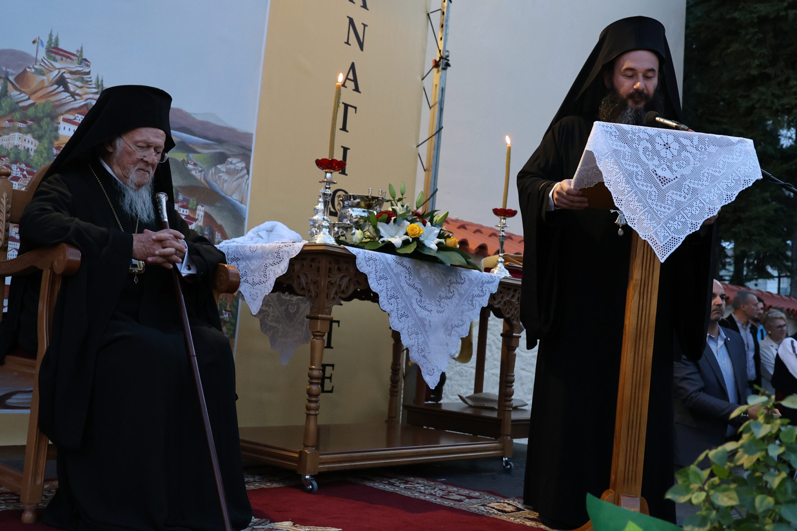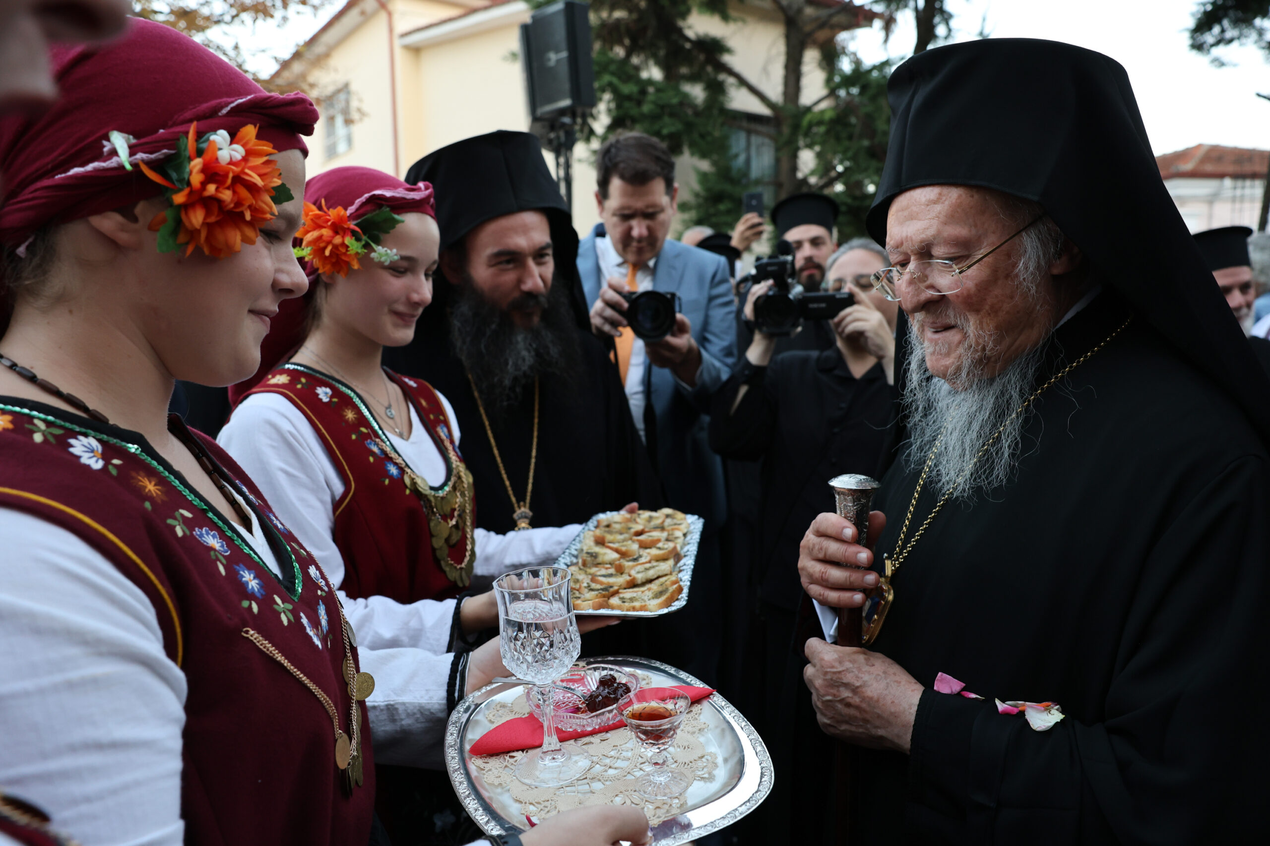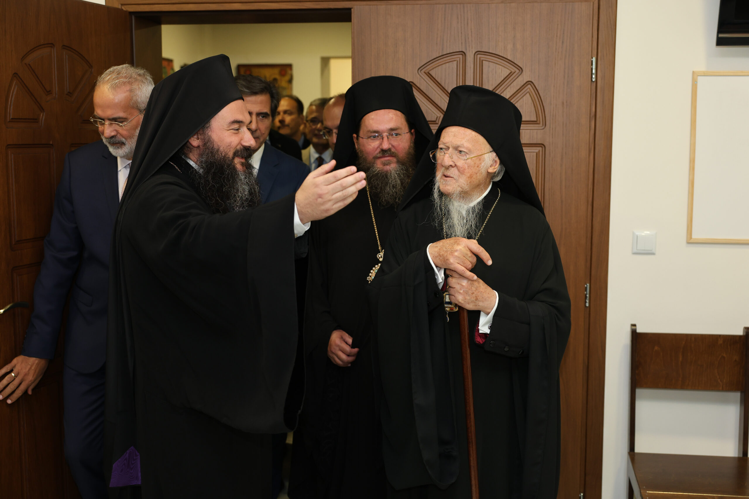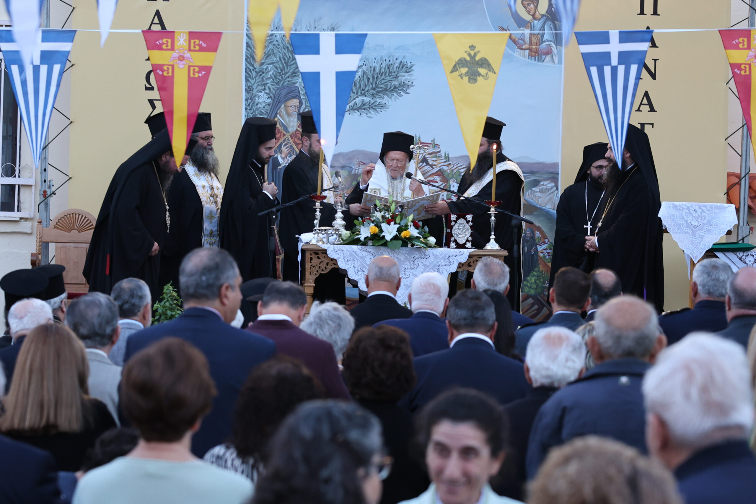 Εν συνεχεία ο Προϊστάμενος του Ναού και Πρωτοσύγκελλος της τοπικής Μητροπόλεως Παν. Αρχιμ. π. Επιφάνιος Θεοδωρίδης καλωσόρισε θερμά τον Οικουμενικό Πατριάρχη διερμηνεύοντας τα αισθήματα όλων των ενοριτών και παρουσίασε την συνοπτικά την ιστορία του Ναού από τον ερχομό των προσφύγων έως σήμερα καθώς και τις δράσεις που επιτελεί η Ενορία στο ποιμαντικό και φιλανθρωπικό της έργο, υπό την καθοδήγηση του Ποιμενάρχου κ Βαρθολομαίου.