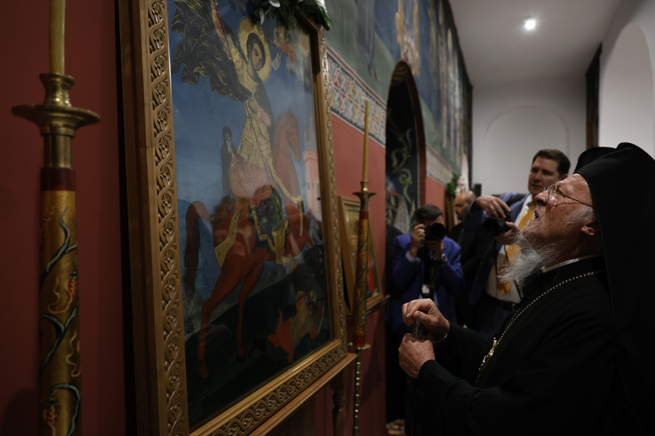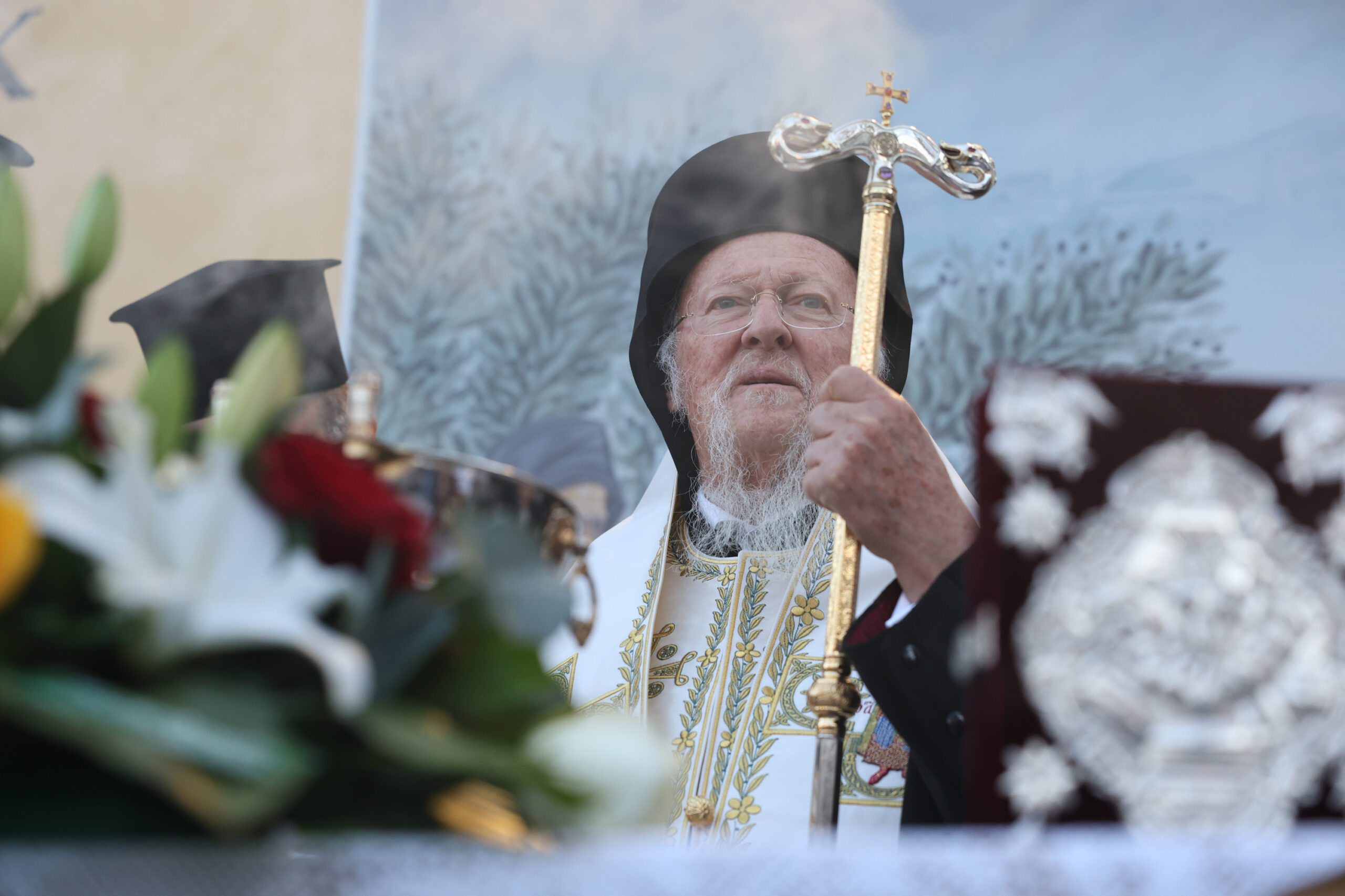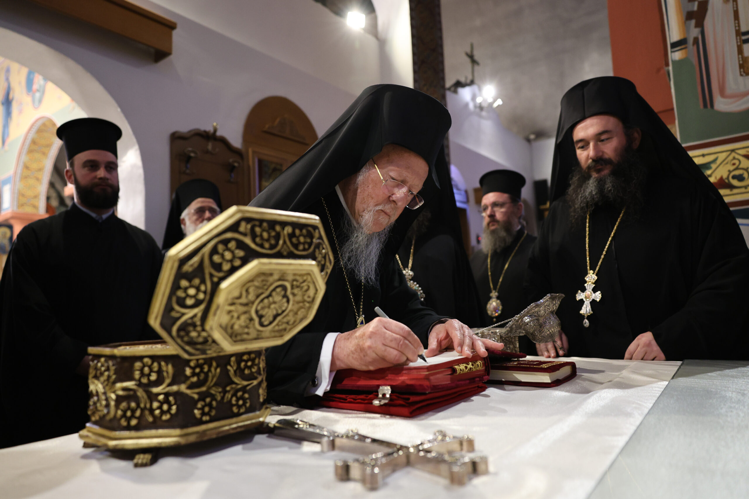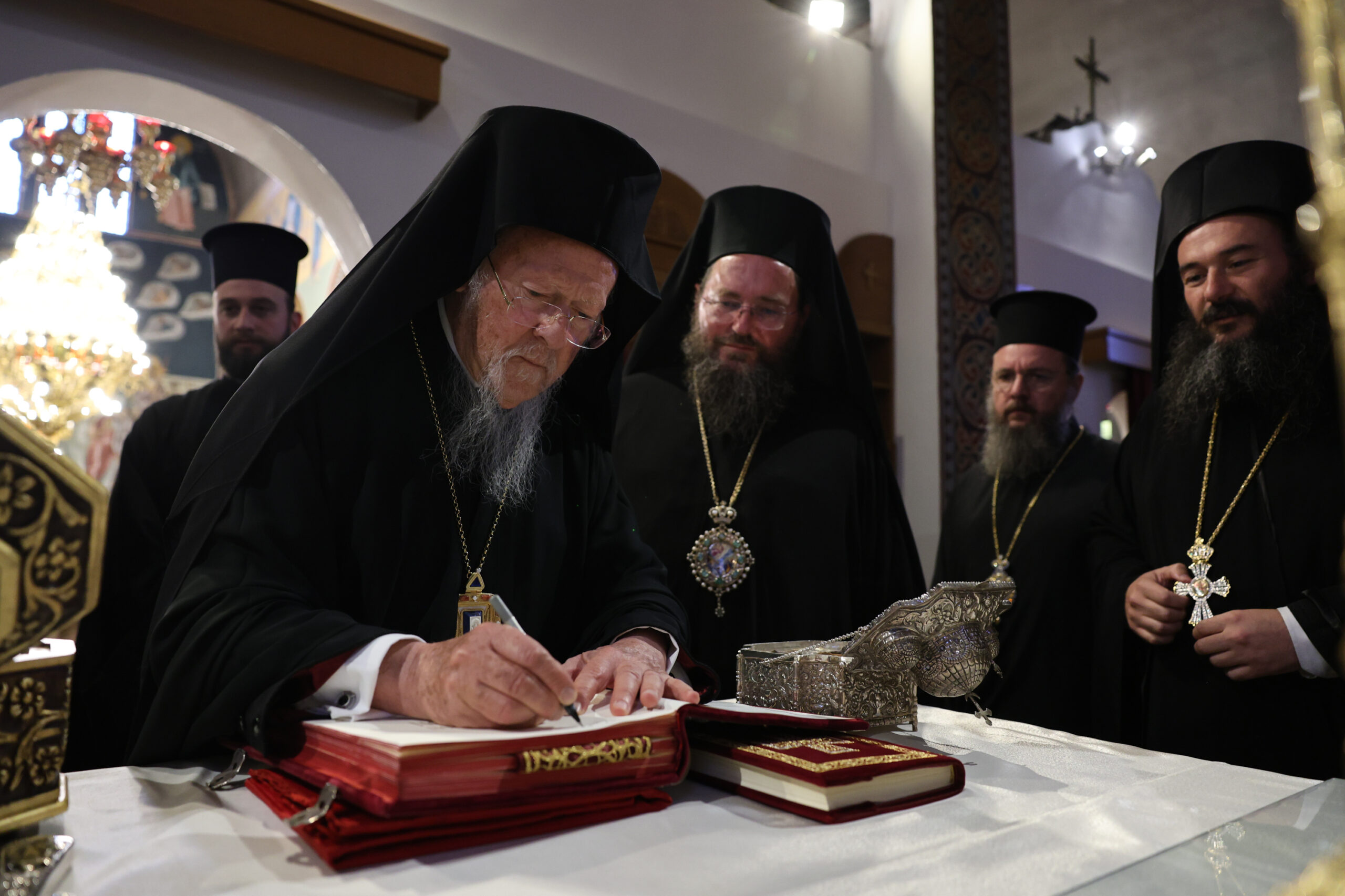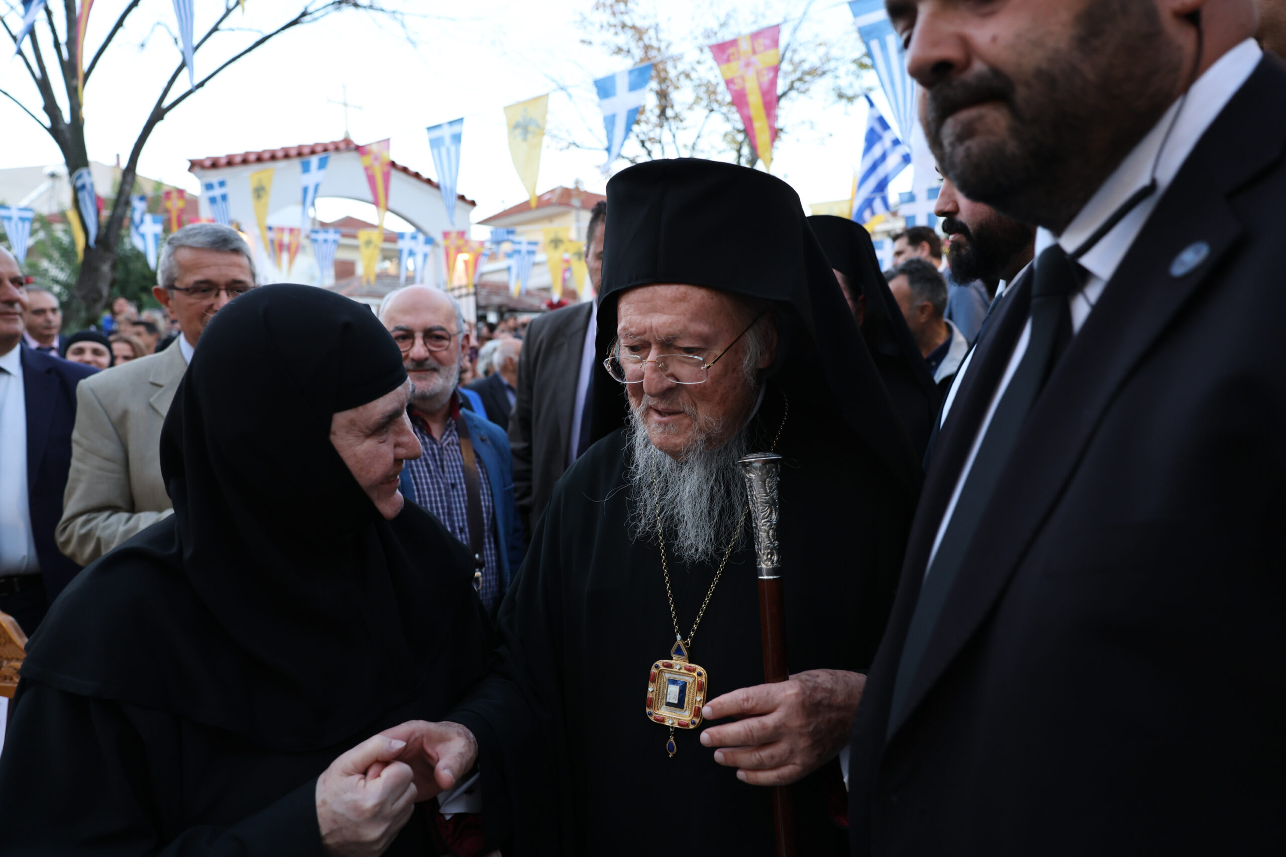 Εν συνεχεία ο Προϊστάμενος του Ναού και Πρωτοσύγκελλος της τοπικής Μητροπόλεως Παν. Αρχιμ. π. Επιφάνιος Θεοδωρίδης καλωσόρισε θερμά τον Οικουμενικό Πατριάρχη διερμηνεύοντας τα αισθήματα όλων των ενοριτών και παρουσίασε την συνοπτικά την ιστορία του Ναού από τον ερχομό των προσφύγων έως σήμερα καθώς και τις δράσεις που επιτελεί η Ενορία στο ποιμαντικό και φιλανθρωπικό της έργο, υπό την καθοδήγηση του Ποιμενάρχου κ Βαρθολομαίου.