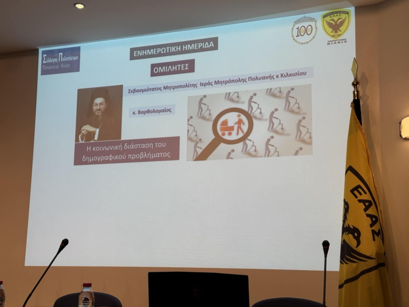 Ομιλητές ήταν ο Σεβασμιώτατος Μητροπολίτης Πολυανής και Κιλκισίου κ. Βαρθολομαίος με θέμα την κοινωνική διάσταση του δημογραφικού προβλήματος και ο Καθηγητής Οικονομικών, πρ. Κοσμήτορας Σχολής Κοινωνικών και Οικονομικών Επιστημών και Μέλος Διοίκησης Α.Π.Θ. κ. Γρηγόριος Ζαρωτιάδης με θέμα την οικονομική διάσταση του δημογραφικού προβλήματος ενώ την ημερίδα συντόνισε ο Πρόεδρος των Αποστράτων κ. Σπυρίδων Τσερτσίδης.